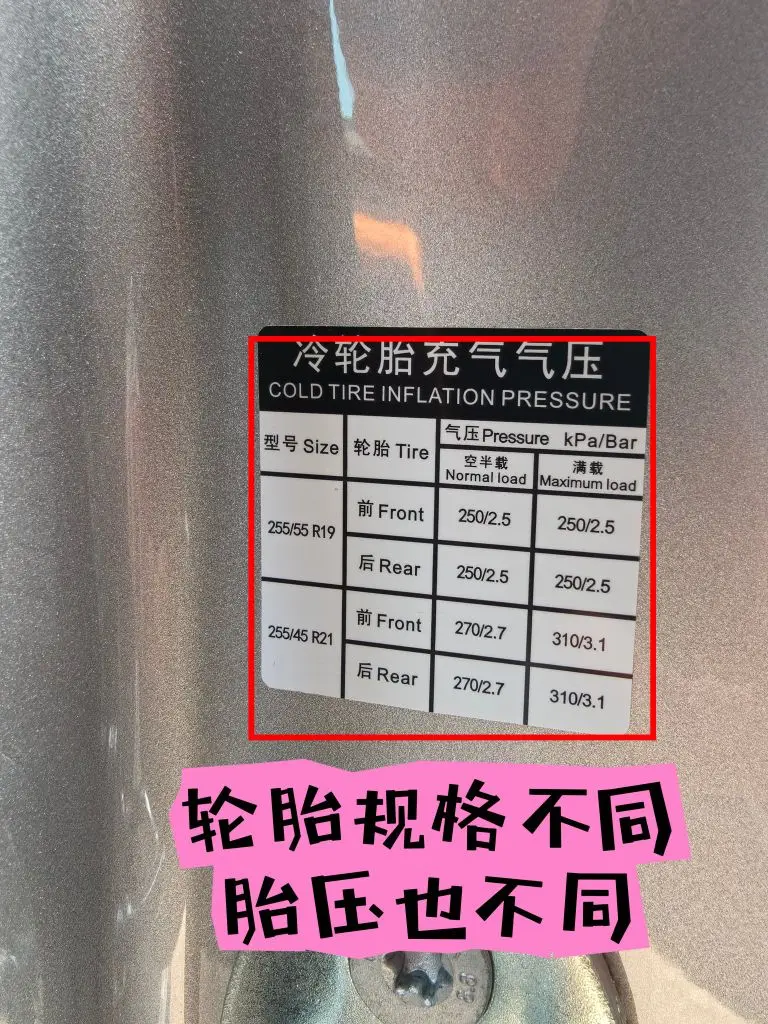 以我的小鹏G9为例,打开主驾驶车门,在车B柱下方,会贴有车辆胎压标签,上面标注了不同载重、不同轮胎规格下的推荐胎压值(单位通常为 kPa 或 bar)。