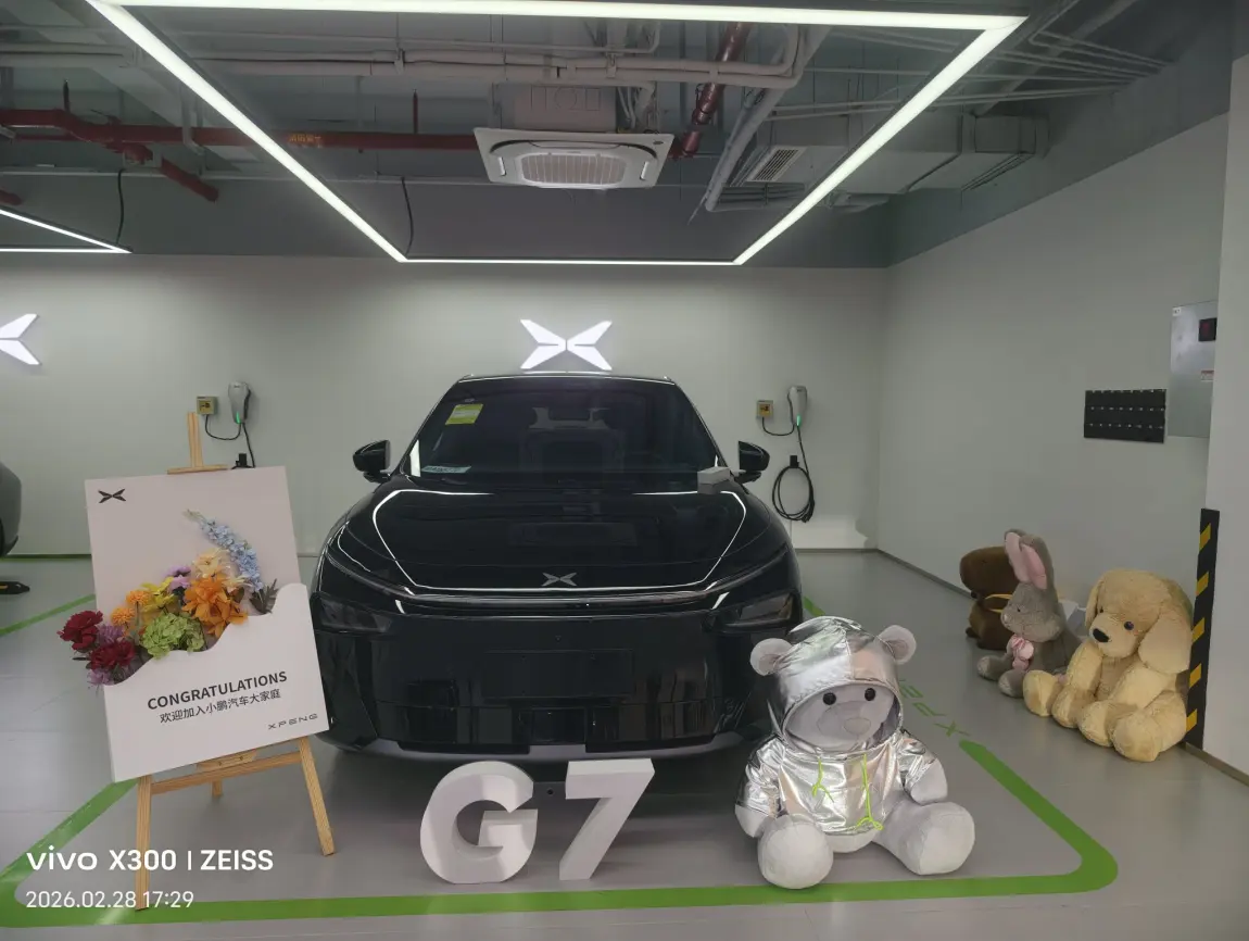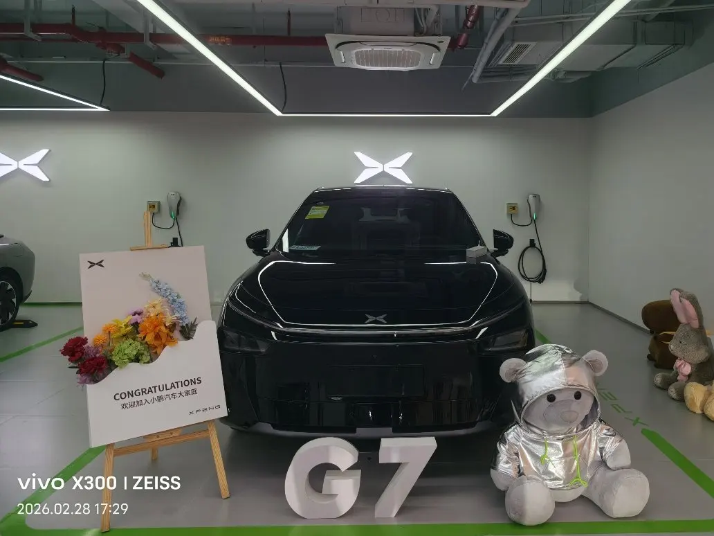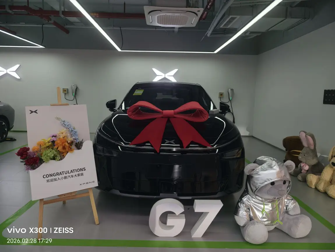 最惊喜的是布置好的专属交付位:鲜花、G7立体字、银色小熊玩偶,氛围感直接拉满!新车几乎无异味,座椅包裹感和智能驾驶体验都超出预期,服务全程无推销、超耐心!🥰