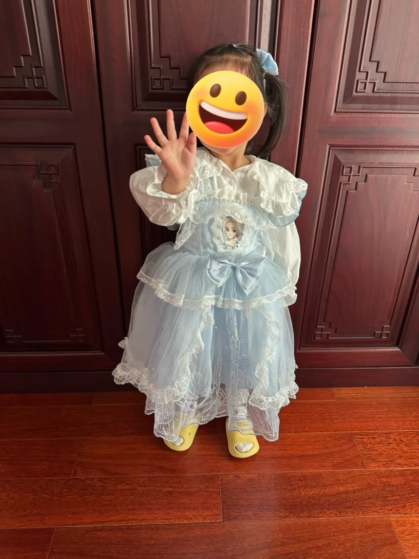 悄悄给新晋女神买了一套她最爱的艾莎公主的裙子。早上起来发现挂在衣架上的蓬蓬裙,两眼放光,心情溢于言表。非常配合地洗漱完,穿上新买的连衣裙,开心得手舞足蹈。