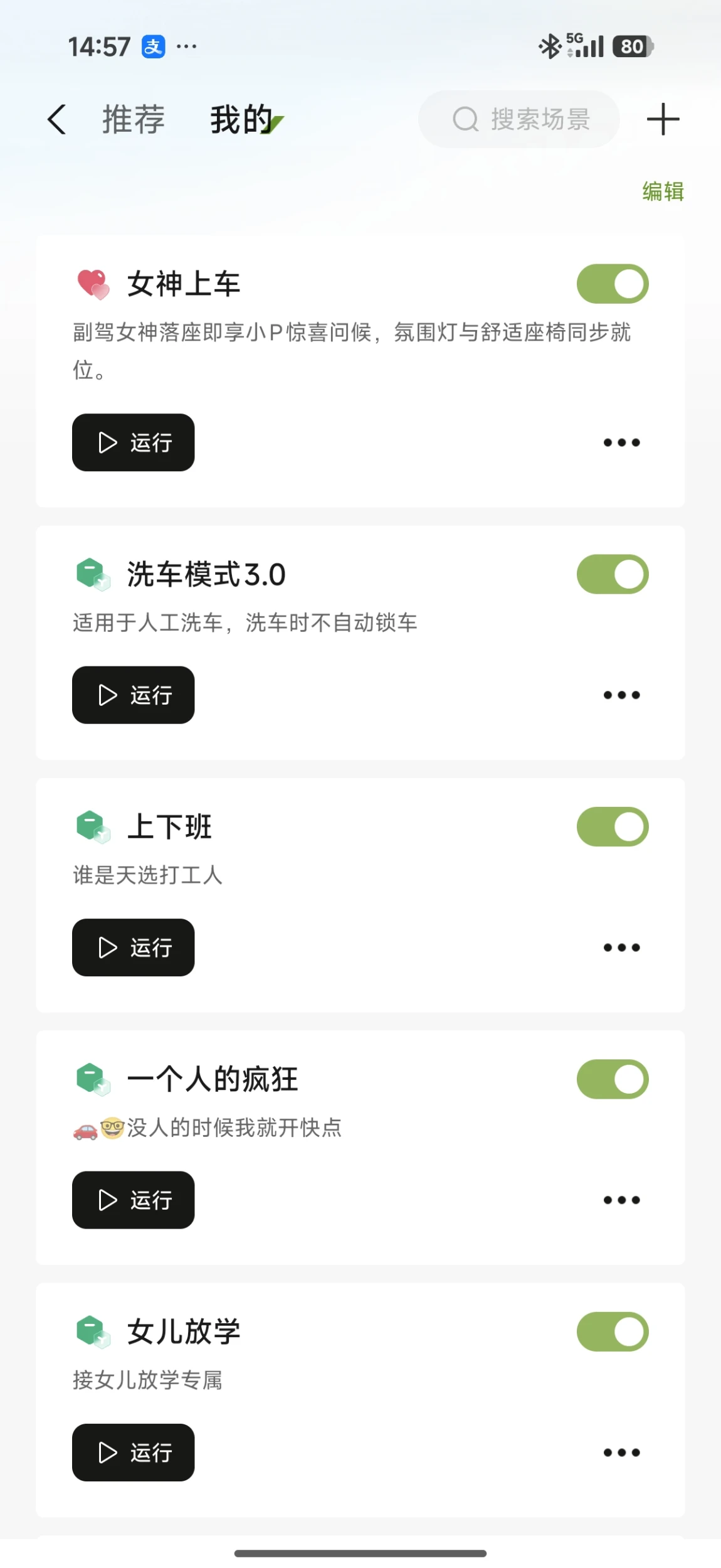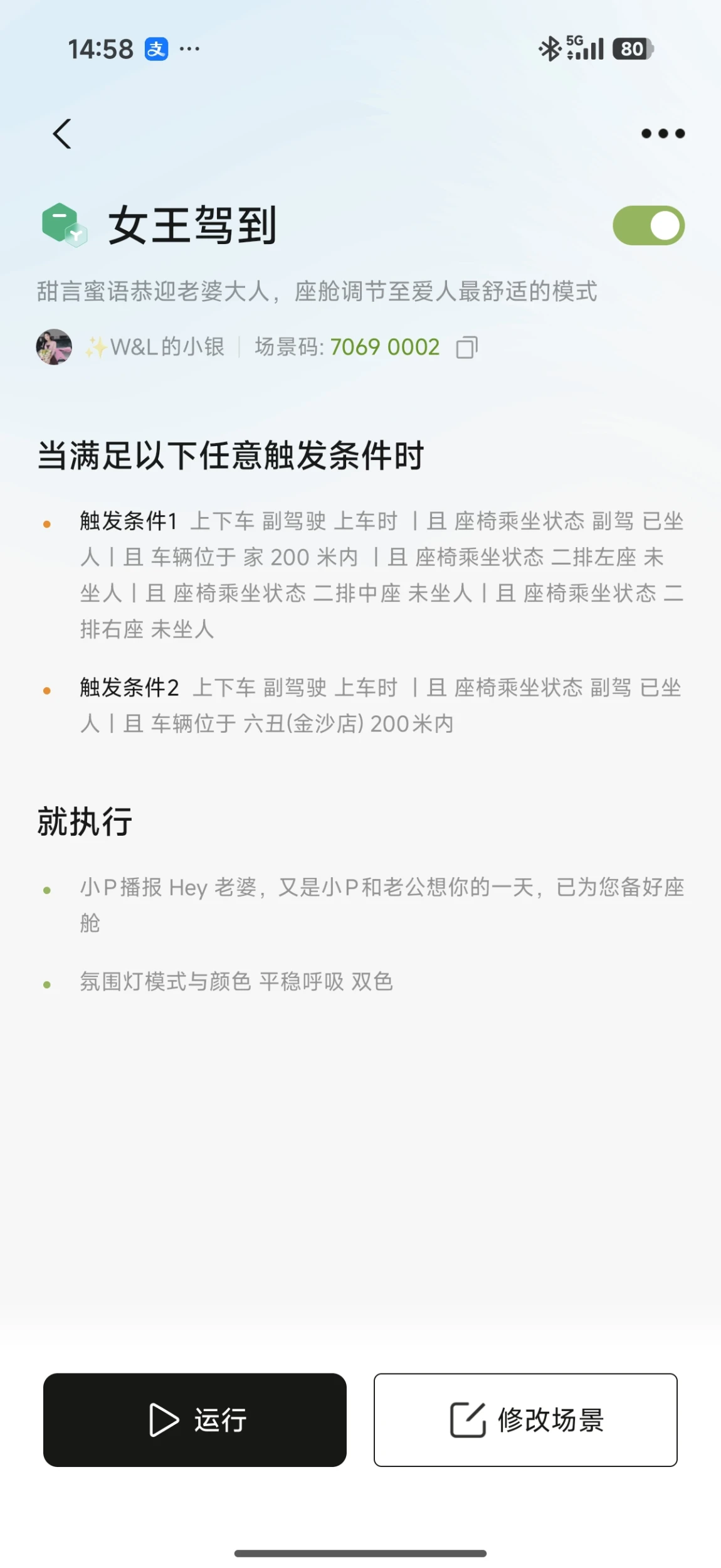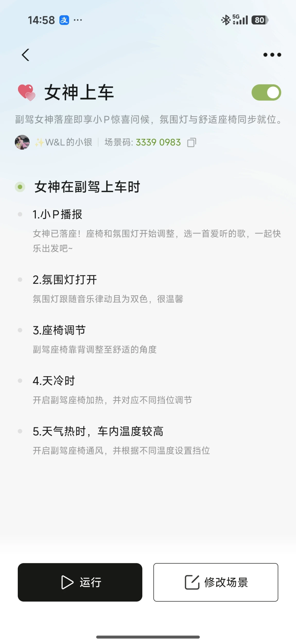 我专门设置了「女神上车」的专属智慧场景,不管她从主驾还是副驾开门落座,车机都会立刻启动一连串的暖心联动: