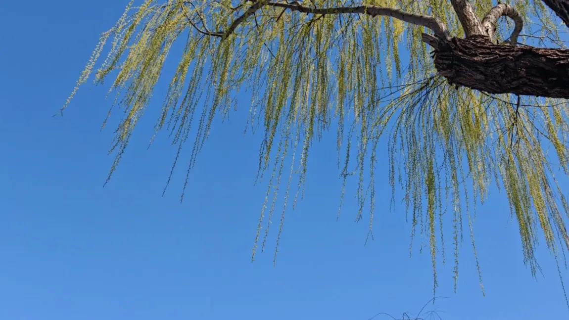 柳枝从湛蓝的天幕中垂落,织成一片嫩绿氤氲的雾,风是它的呼吸,轻柔地摇晃着光线。