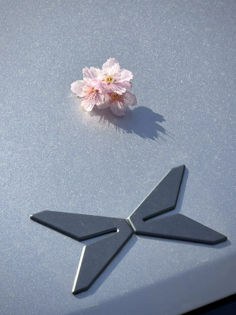 捡一朵樱花和小鹏Logo合影,美中不足就是车有段时间没有洗了😔