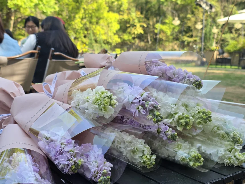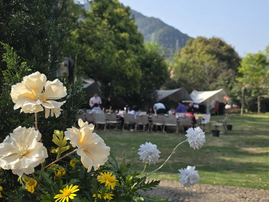 天气格外给力,阳光暖暖洒落,微风轻拂草地,处处都是春暖花开的美好气息。现场布置温馨又有仪式感,鲜花、天幕、休闲座椅一应俱全,一到场就被满满的氛围感包围,仪式感直接拉满。