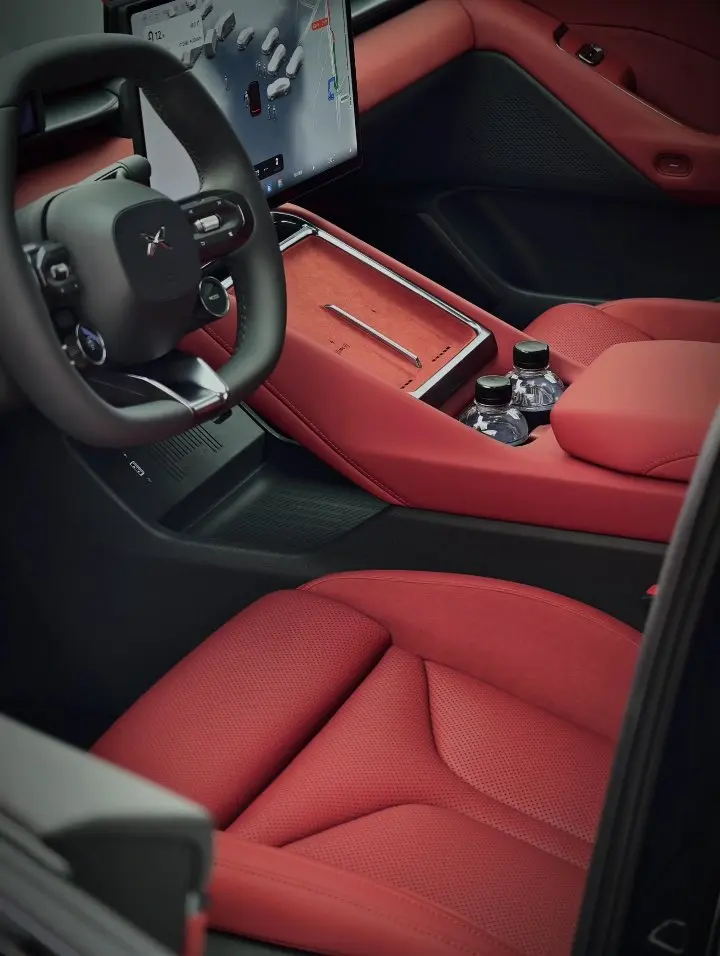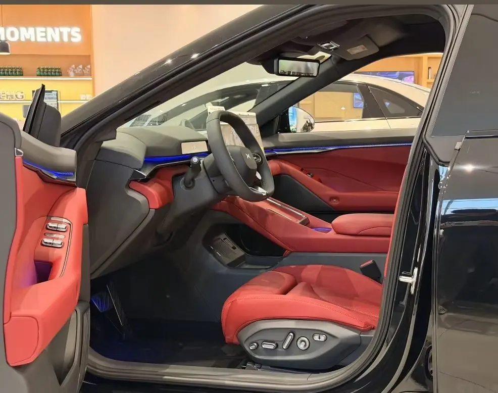 坐进车内,红黑撞色内饰瞬间俘获我心。细腻翻毛皮与打孔真皮包裹座椅,触感柔软又透气,搭配蓝色氛围灯,轻奢感拉满。极简座舱设计没有冗余按键,所有操作都集中在大屏,既高级又实用。