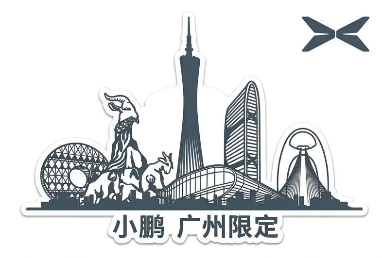右上角黑色的小鹏车标,代表着“愿景”与“未来”,保证品牌独立辨识度,,底部采用了极简的线条勾勒出广州极具代表性的地标群(五羊石像,广州塔“小蛮腰”和广州圆/猎德大桥/大剧院)。让广州车主产生强烈的心理认同感——这不仅是一辆小鹏,更是属于广州的小鹏。