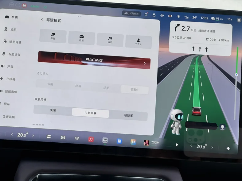 中控屏的实时路况渲染清晰直观,能精准识别道路标识、前车距离及导航路线。同时,车辆支持舒适、运动、节能等多种驾驶模式,还能搭配独特的声浪风格,兼顾了科技感与驾驶乐趣。