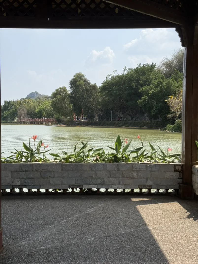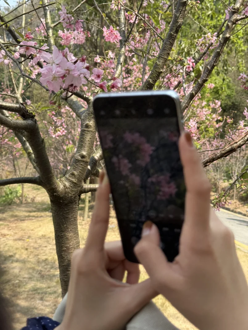 北门的樱花沿着湖边层层铺开,粉白的花瓣和远处的喀斯特峰林、碧绿湖水相映成画。下午四点的阳光刚好,透过花枝洒下来,风一吹就下起温柔的樱花雨,落在发梢、肩头,连我的小鹏P7+都沾了几分春日浪漫。