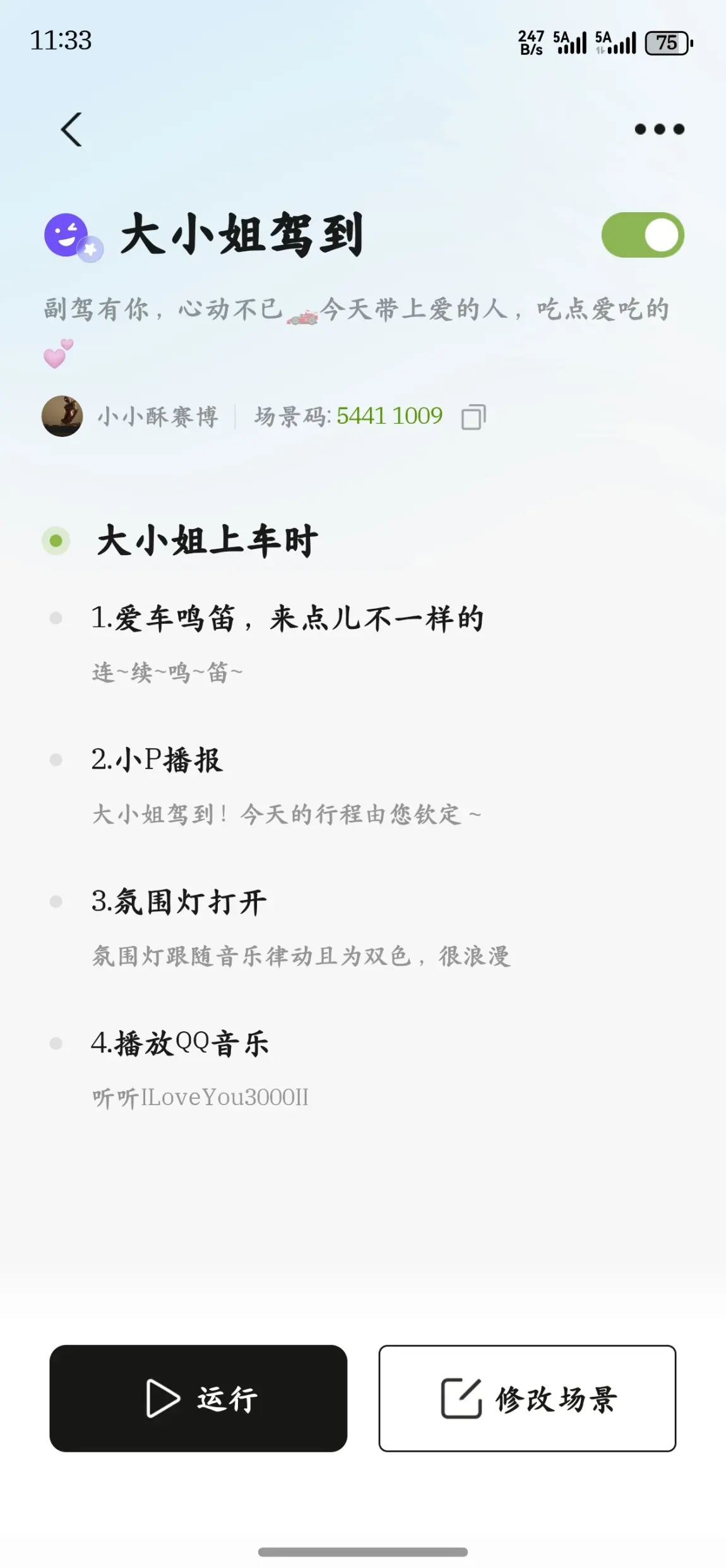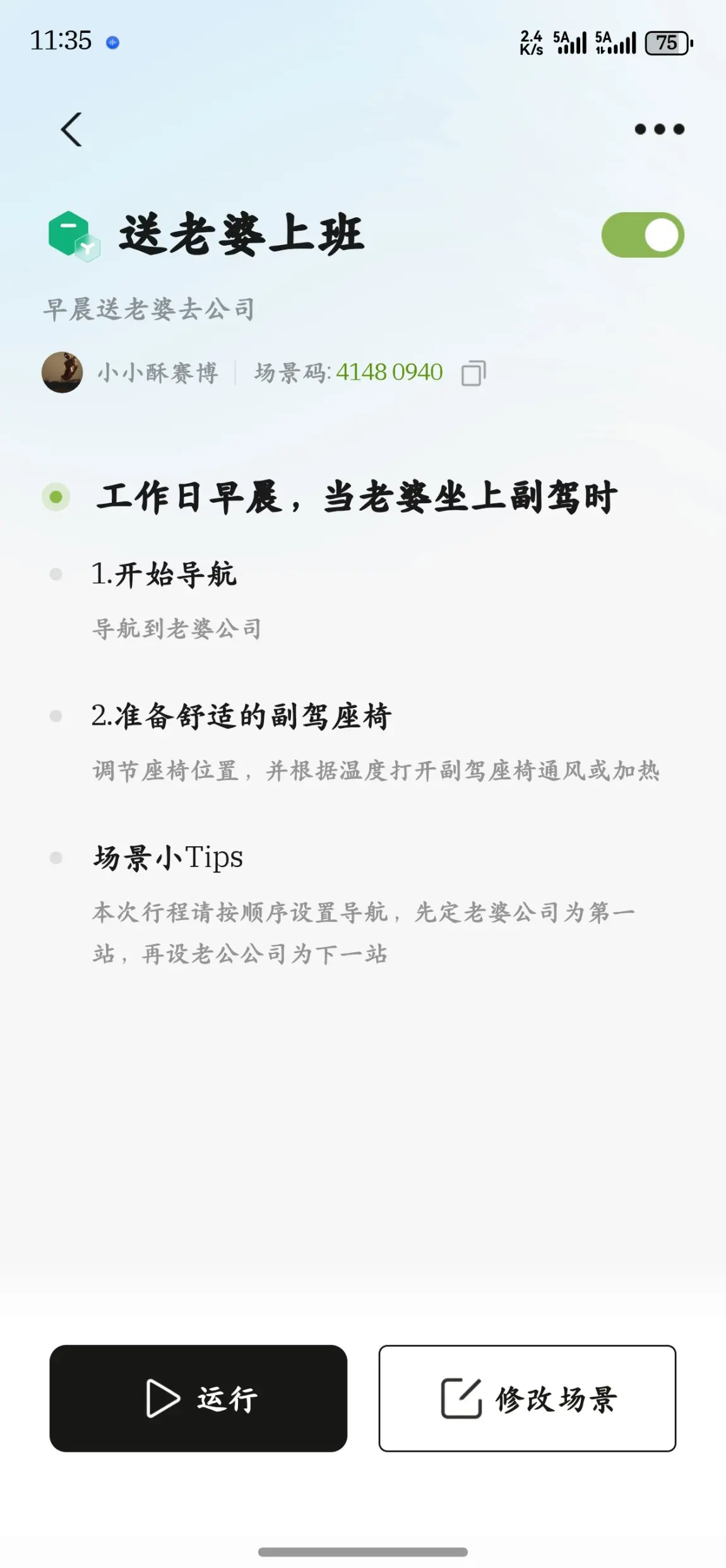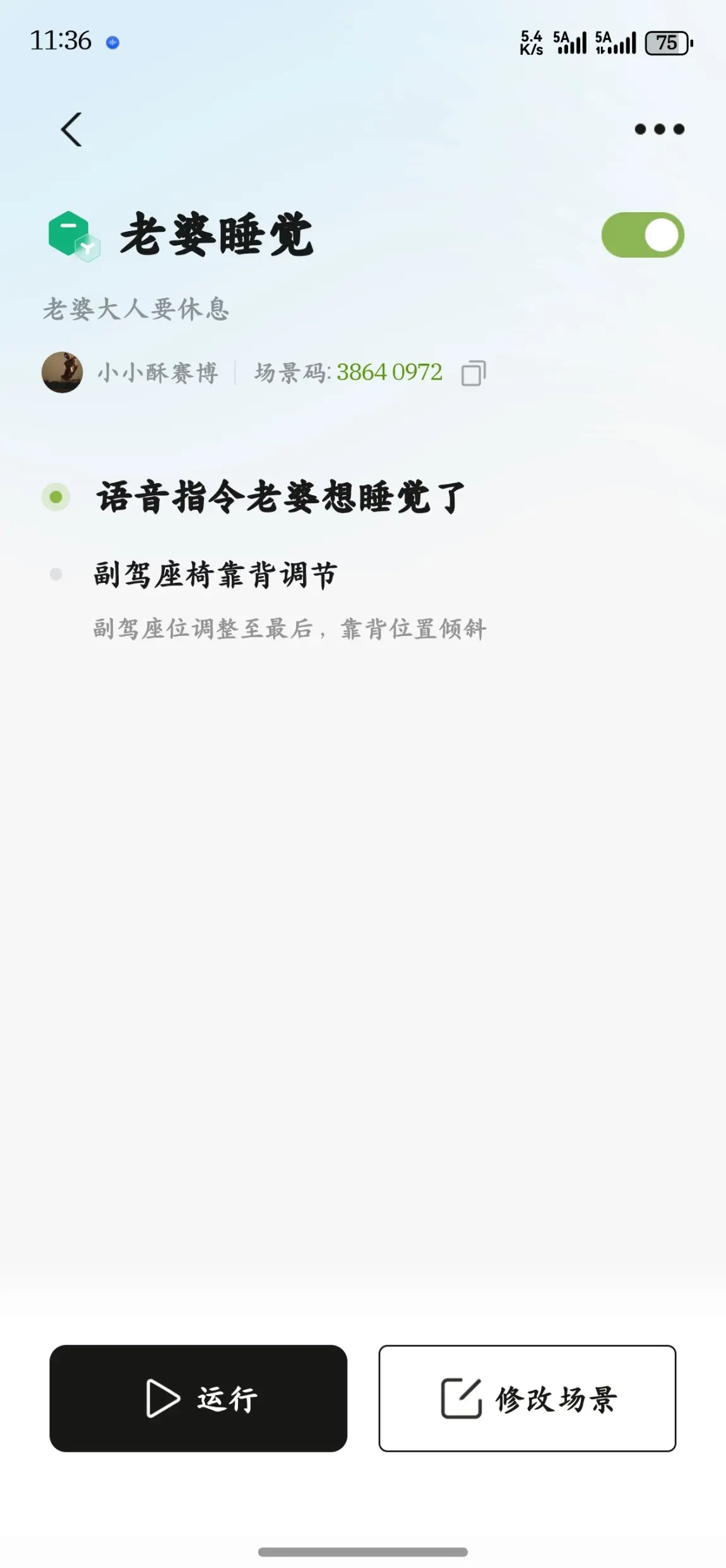 这些场景都是她的最爱,她最喜欢第一个场景,只需要跟小p说一下她想睡觉,这时候副驾就会自动往后移,老舒服了,希望你们也能用上这个场景,很舒服的,等到她睡醒就会直接到单位了。