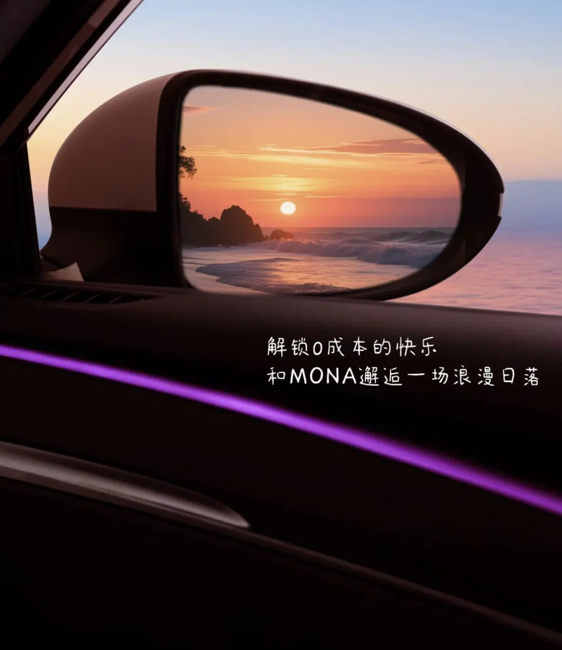 紫色氛围灯温柔亮起,后视镜框住了橘色晚霞与翻涌的海浪,不用滤镜也能拍出电影感。原来最治愈的风景,一直都在行驶的路上,在MONA的小小镜面里。