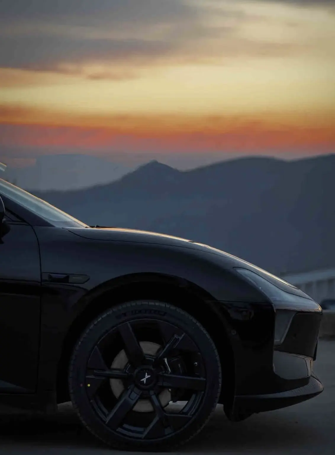 夕阳给车身镀上一层暖金,轮毂上的小鹏标识清晰可见,背景是层叠的山峦与暮色。硬朗的车身线条与温柔的山景形成反差,既有轿跑的运动感,又藏着细腻的温柔。