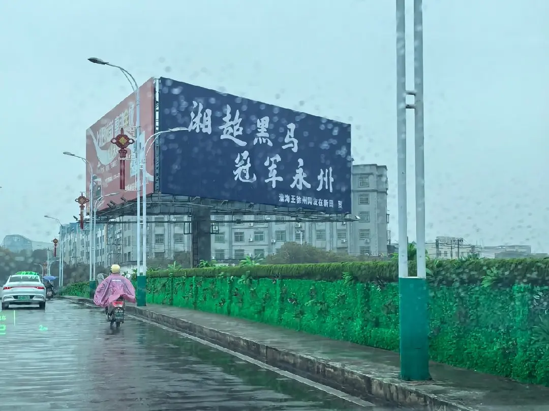 春雨淅沥的永州街头,我开着小鹏G7 Ultra穿梭在湿漉漉的路面,目光被那块醒目的广告牌牢牢抓住——“湘超黑马,冠军永州”。