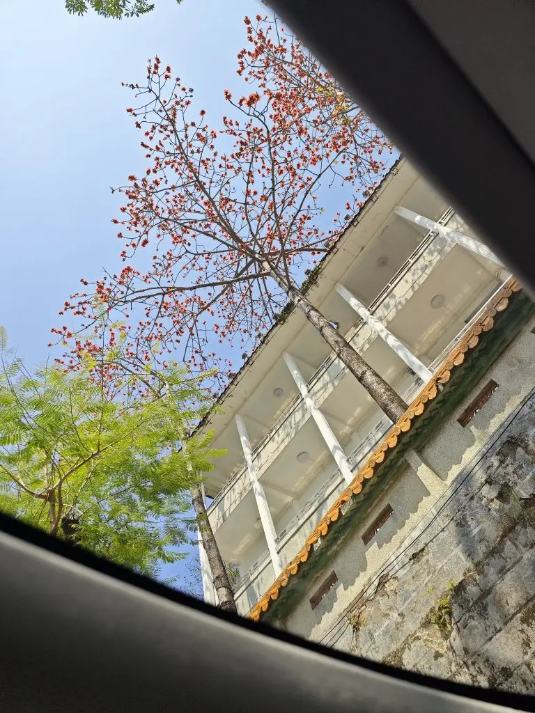 透过天窗仰望红得似火的木棉花,