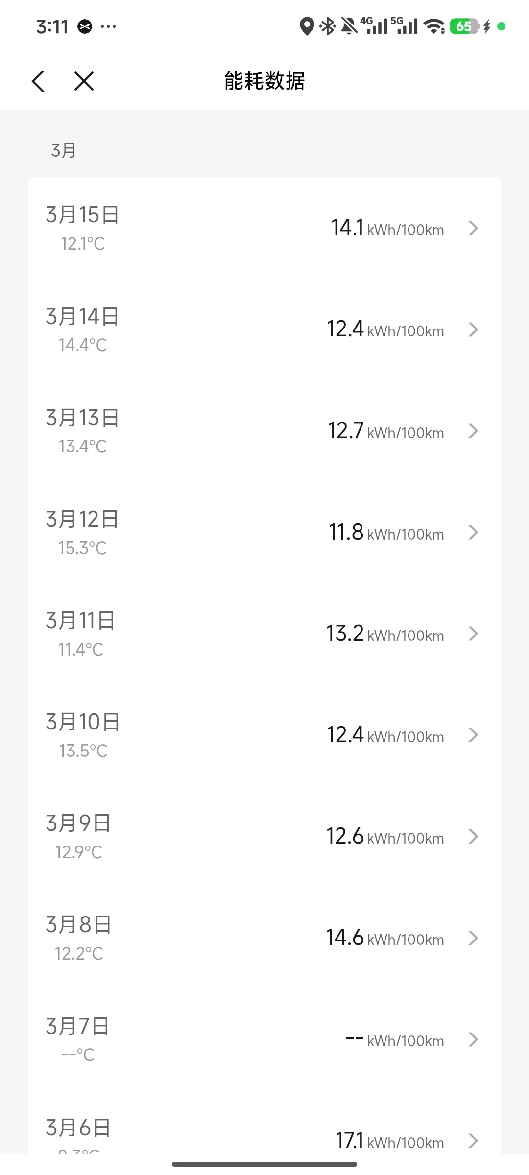 但随着气温的升高,现在能耗已经悄悄来到了11-12左右。有几天中午,气温窜高到20度左右,我甚至开到过7点多的能耗,这在我的能耗列表里是创记录的。