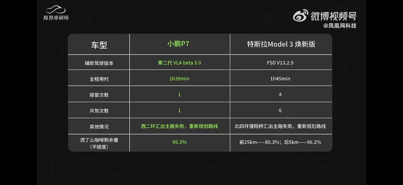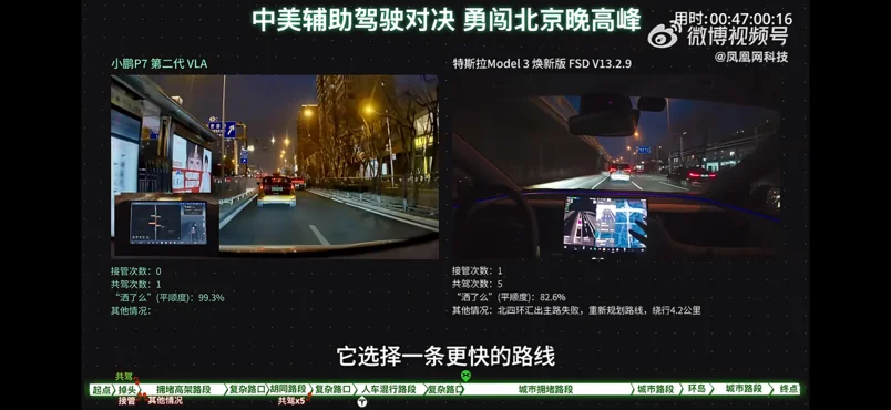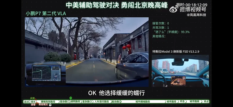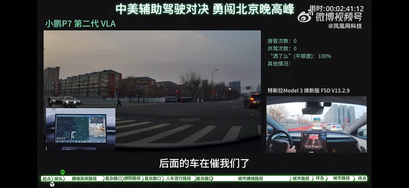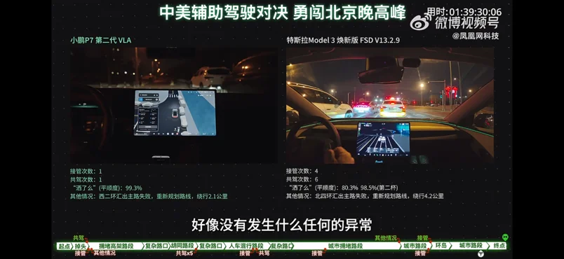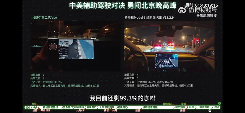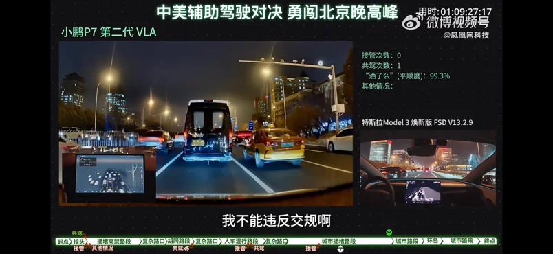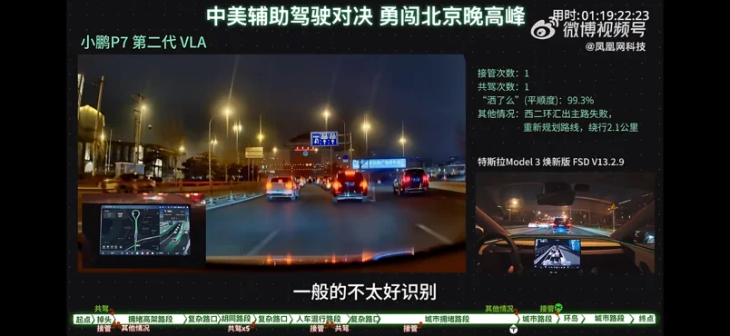 今天看到凤凰车研所北京晚高峰测了小鹏P7的第二代VLA🚗,开了1小时39分钟⏱️,掉头、拥堵高架、复杂路口、胡同、人车混行、城市拥堵、环岛这些复杂路都走了🛣️,系统表现是真稳🛡️,真丝滑呀✨。真正得自己上手接管的就两次:一次是路上标线不清楚❓,跟着前车社会车辆走错路了。还有一次不算系统的锅,是后面车一直按喇叭📢,没办法才踩了脚电门。有一次走错路是因为想从主路出去,没在最右侧车道结果200米外就一直是实线⚠️,系统不肯违规变道!结果重新规划了路线🗺️。