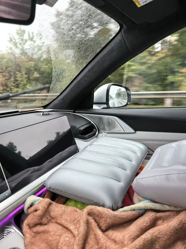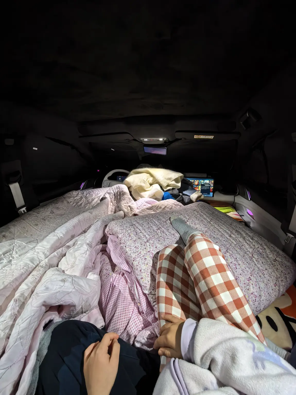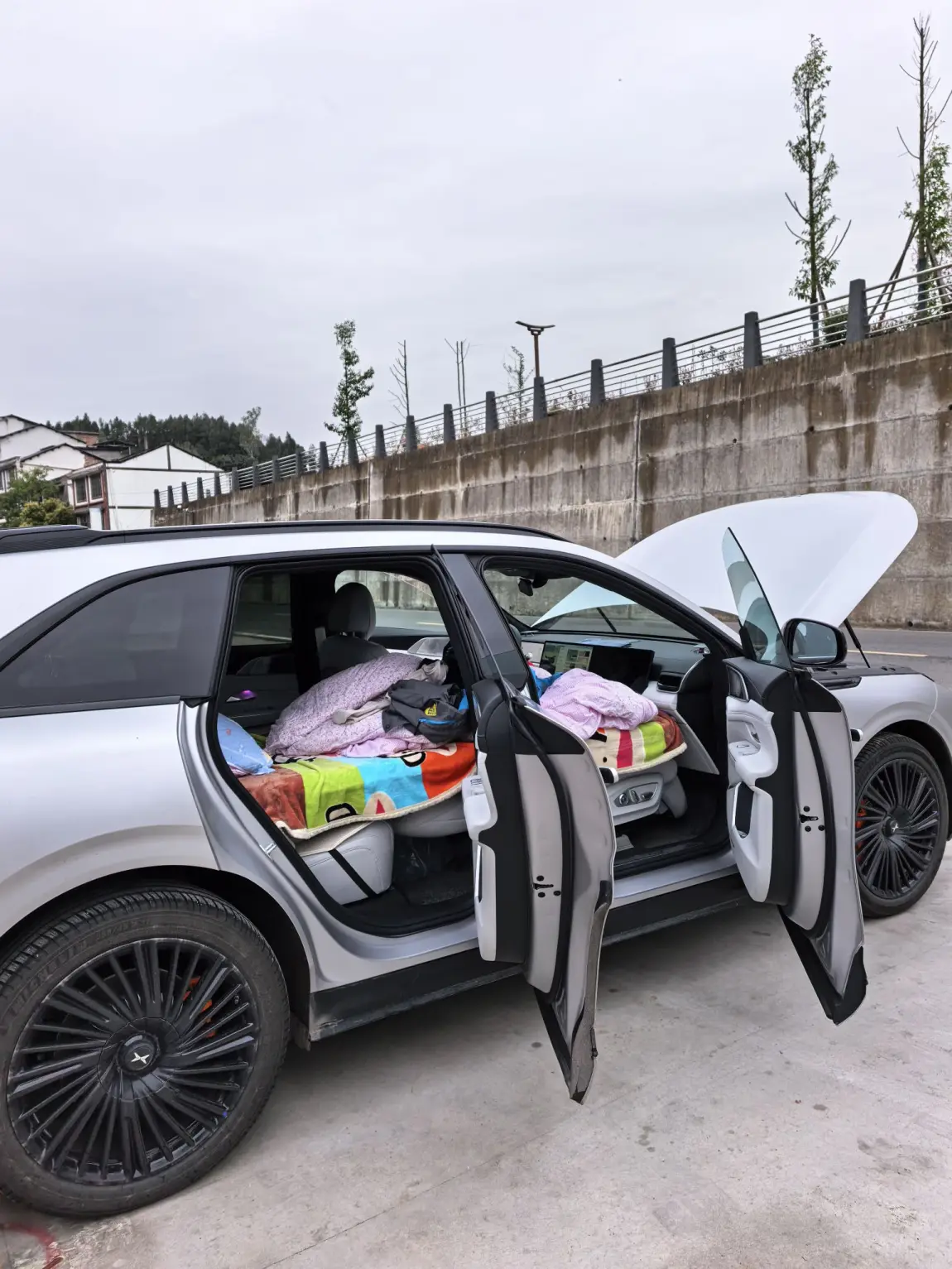 傍晚,我把后排座椅放倒,铺上厚厚的被褥,开启小鹏G9的露营模式。车内温度恒定在26℃,空调轻柔送风,窗外是沉沉的夜色和偶尔掠过的虫鸣。睡前看了眼电量,47%的续航足够安心。