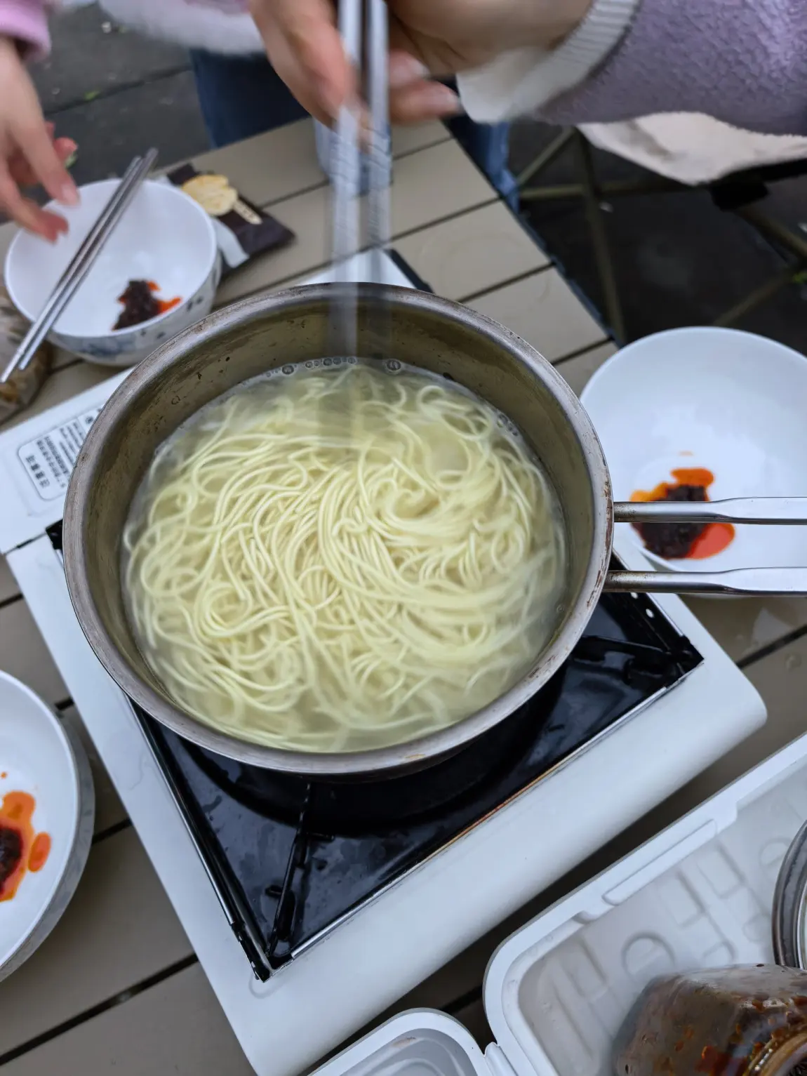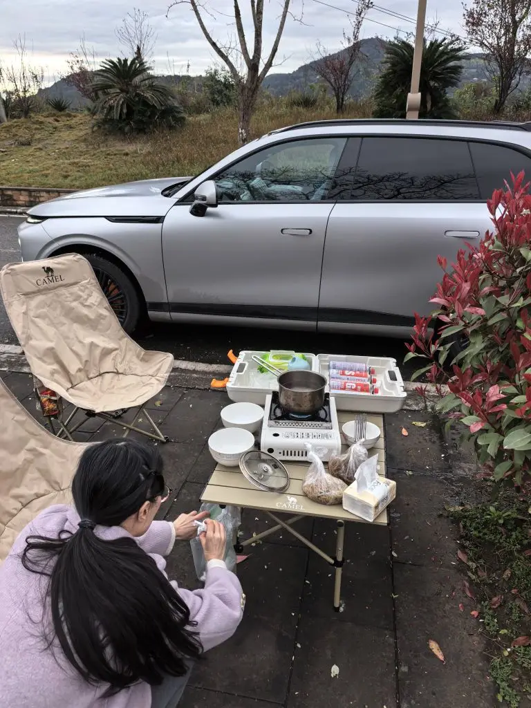 抵达湖边时,雨势稍歇。我把后备箱里的露营装备搬出来:卡式炉、折叠桌、鱼竿、睡袋……G9的大后备箱塞得满满当当,却还能轻松取出,这空间感真的太适合带家人出门撒野了。支起桌椅,架起小锅,煮一碗热气腾腾的面条,就着淅沥的雨声,连简单的调味都变得格外香。