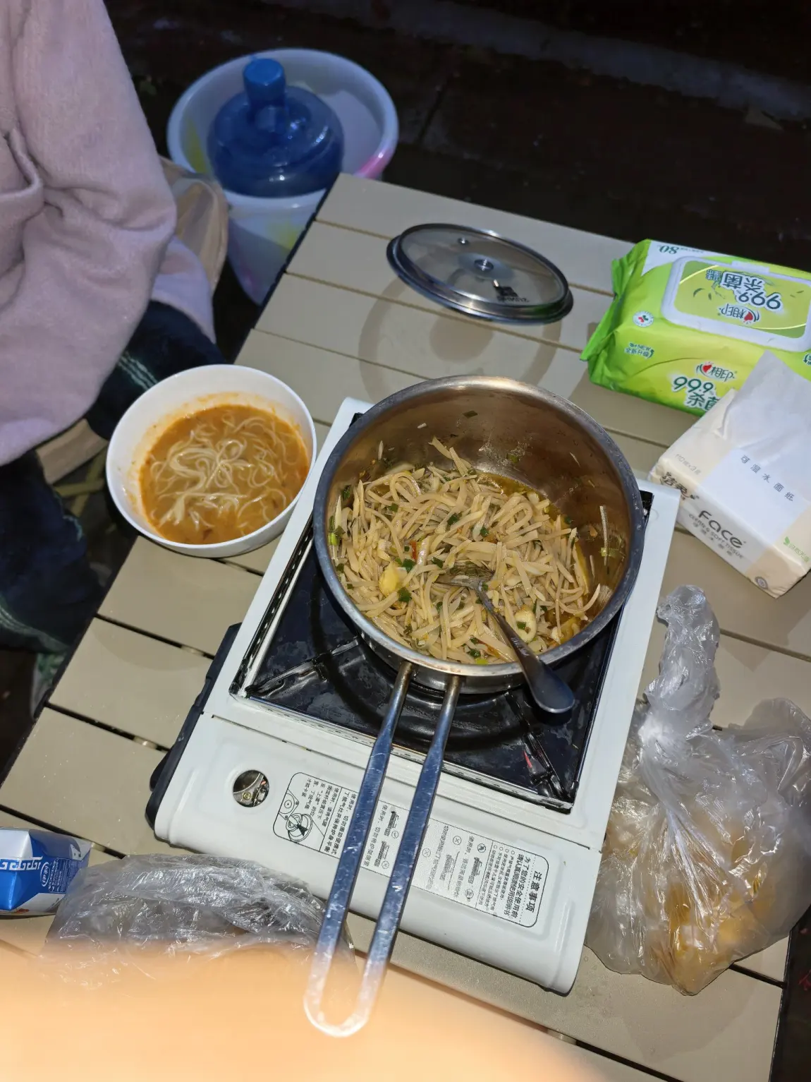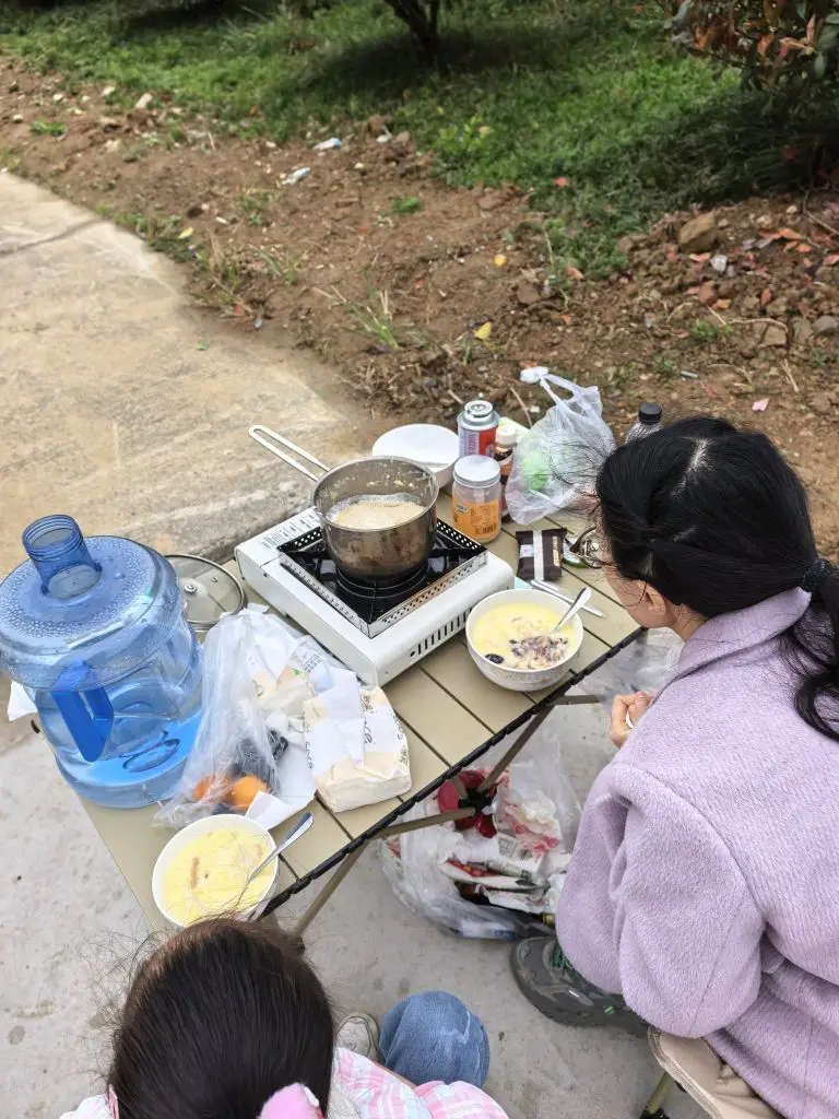 第二天清晨醒来,第一件事就是打开APP看电量——一夜过去,仅掉电5%!在8℃的雨夜,这个表现让我彻底放下心来,完全不用担心第二天的返程续航。洗漱完毕,再煮一锅热乎的笋丝汤,就着晨光慢慢享用,这才是露营该有的样子。