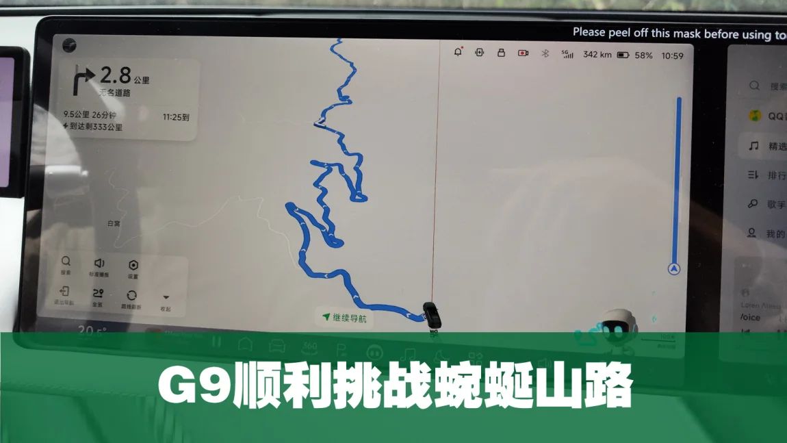 弯弯曲曲的爬山路线,真的非常有挑战性,弯道多且道路狭窄,但G9动力、转弯精准控制都能从容应对,空气悬挂也对路面颠簸感的过滤让旅途变得舒适。