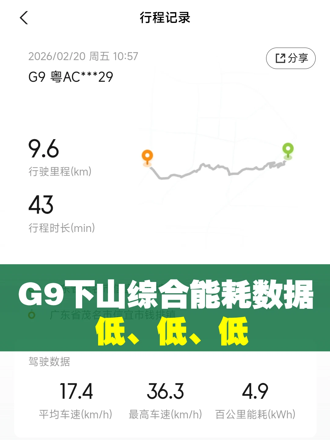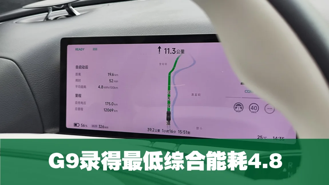 G9从山顶下到山脚,大概10km路程,坡度陡峭,这段路的综合能耗是4.9kwh,后面继续开了月10KM的县道水泥平路路段,我拍到的最低能耗是4.8kwh,能耗真的是史无前例的低、低、低!我赶紧拍照记录。