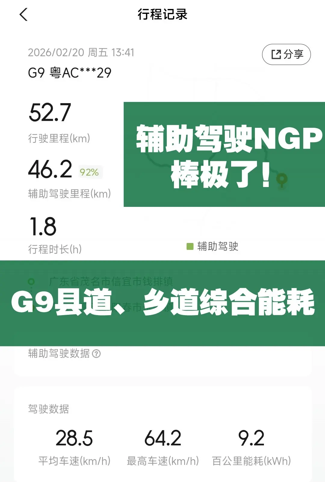 春天这个季节,开电车最适合不过了!NGP辅助驾驶约46KM,占比92%,综合能耗是9.2kwh,对于车长将近5米的中大型SUV,走在县乡道水泥铺装路面,我认为是同级车型中,电耗管理最TOP级别了!