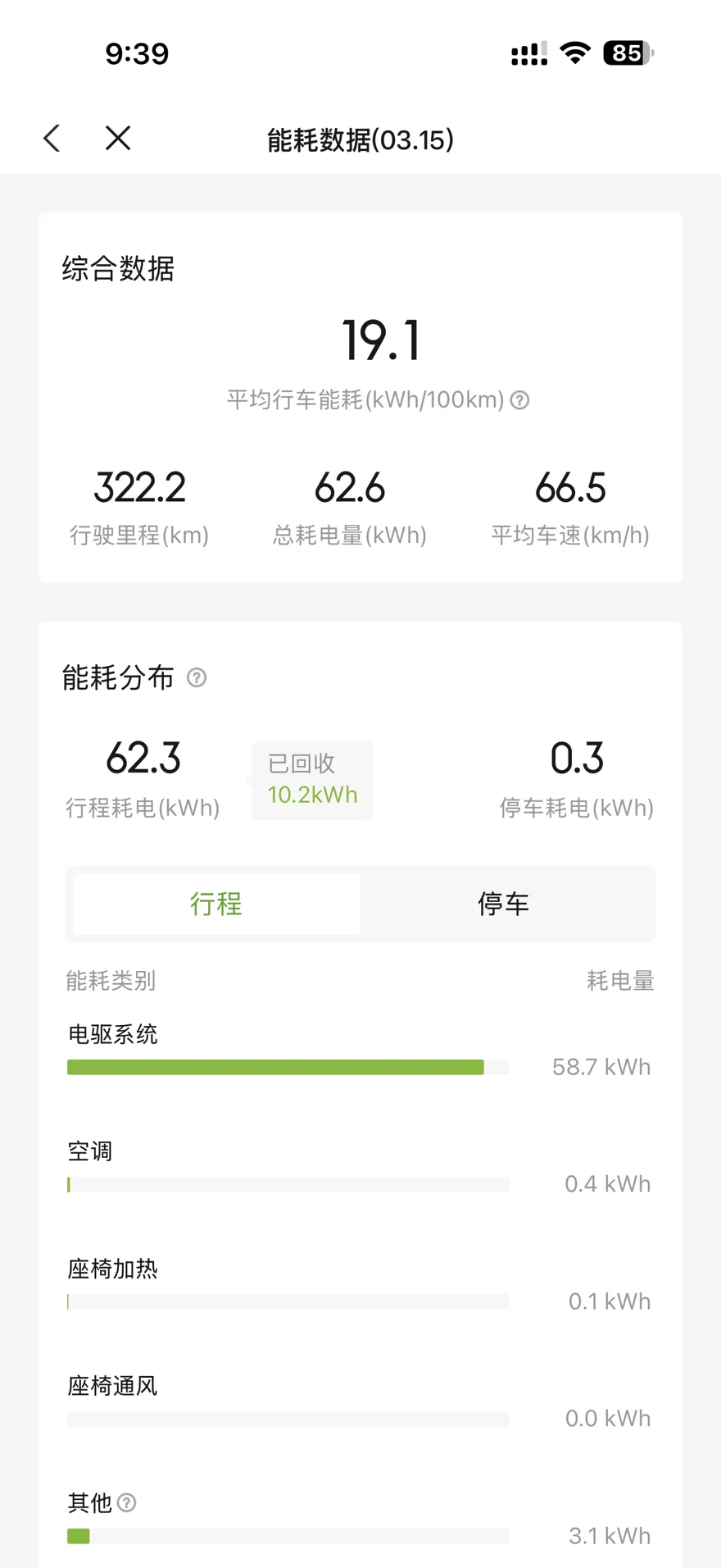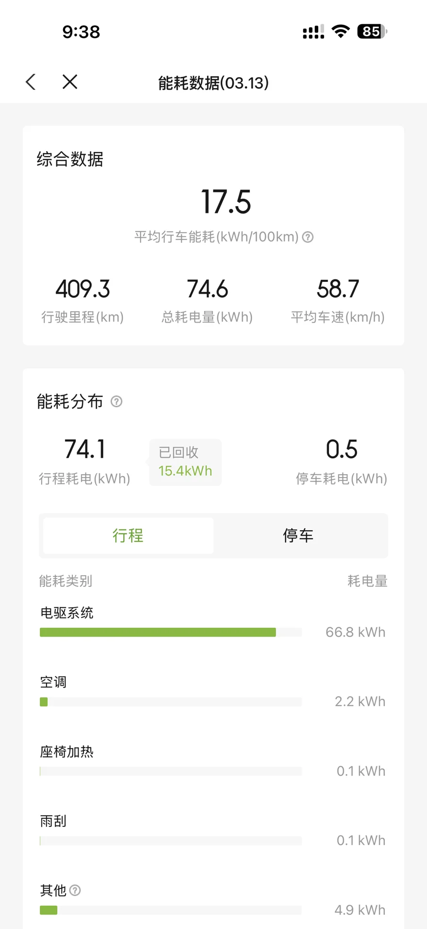返程高速多、连续山路+爬坡,车速也不慢,能耗大概在19度多,这种路况下已经非常能打了。