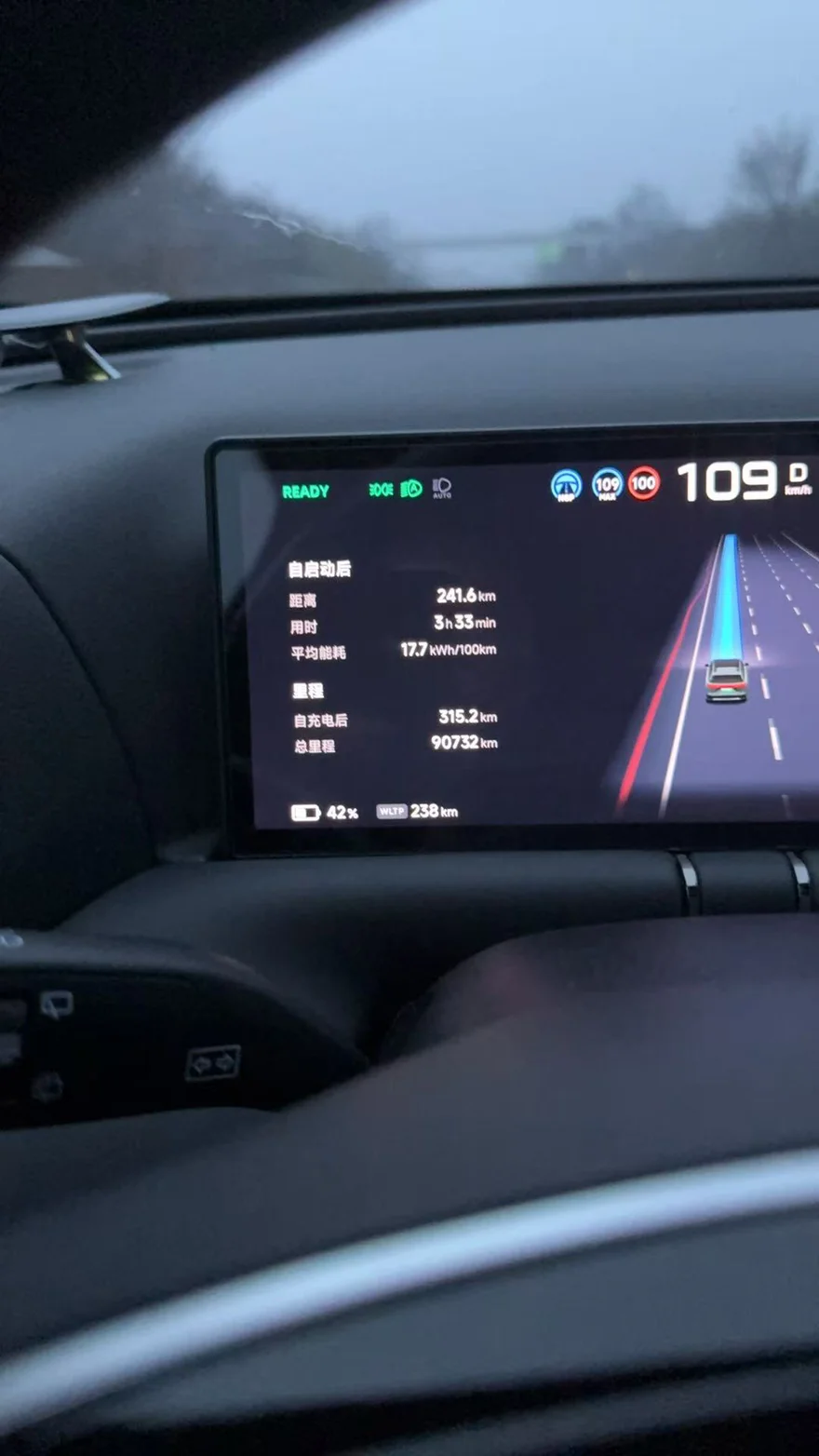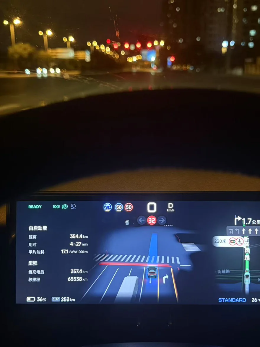 去程碰上阴雨天,路面湿滑,全程高速+智驾,平均能耗也就17度多,本来以为雨天电耗会飙升,结果比我预期稳太多。