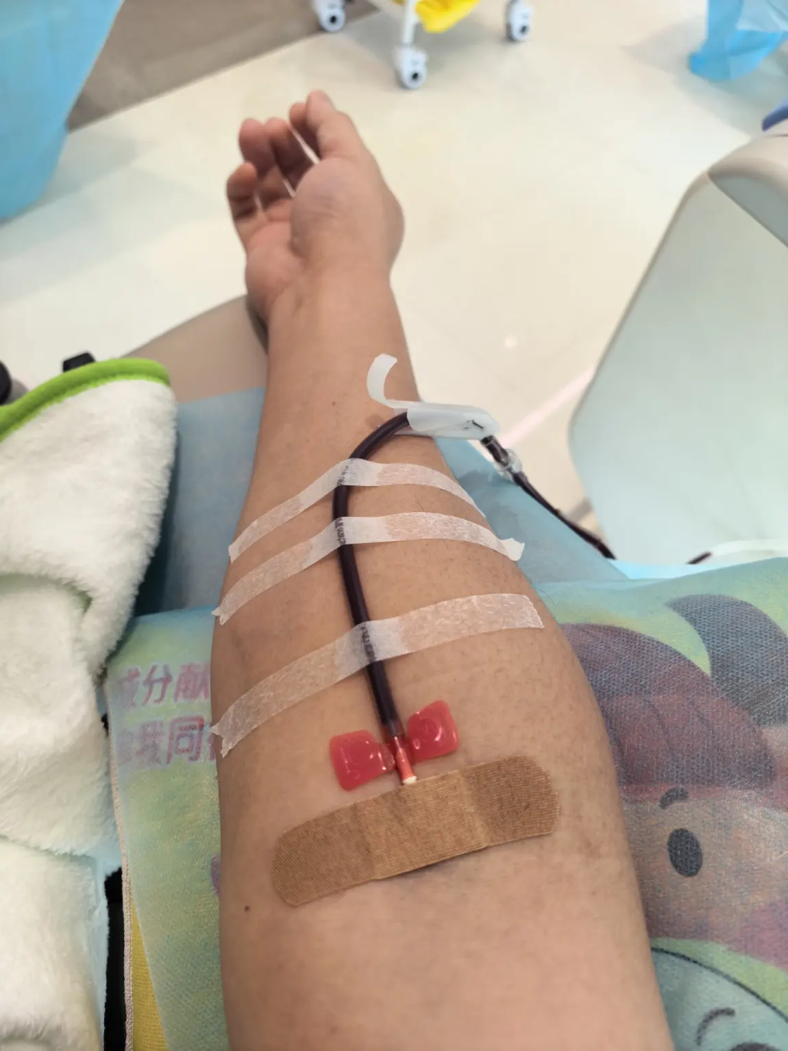 到了医院,献血的过程有点冷飕飕的❄️。我看着自己的血液一点点流进采血袋,心里却暖暖的——这可是能救人的“热血”啊!