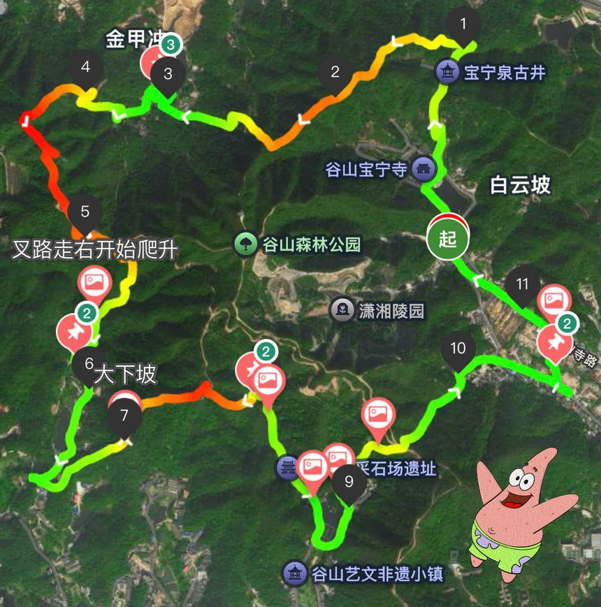 这次挑战的谷山派大星环线,全程11.45公里,累计爬升766米,轨迹如五角星般蜿蜒在山林间,每一步都是与自我的博弈🧗♂️。从宝宁寺旁的起点出发,起初是平缓的水泥路,渐渐过渡到碎石遍布的野径,再到近乎垂直的陡坡爬升,手脚并用的瞬间,体会徒步的真谛——从不是轻松的坦途,而是与身体的极限对话。