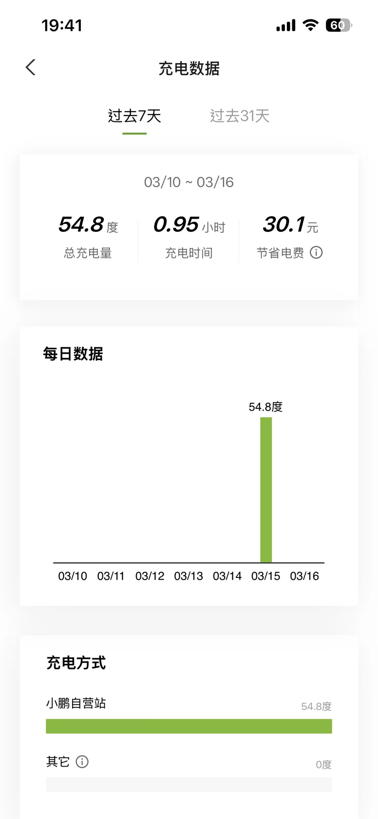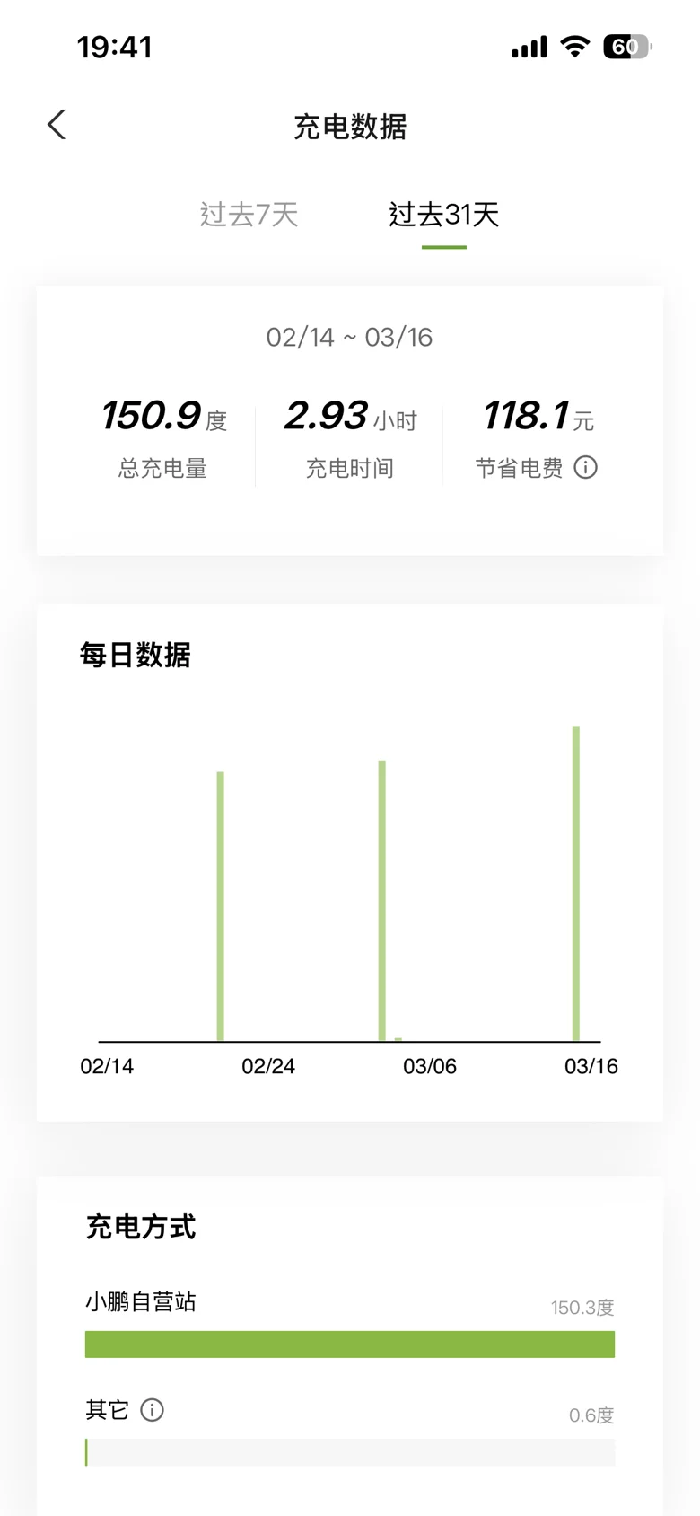 🚗🚗先算充电账⚡:过去31天充了150.9度电,大部分都在小鹏自营站解决,还能用上各种优惠券和活动福利,算下来每度电成本比家充还划算。最近的春日焕新电卡、开工满电活动,2元服务费券、5折券轮番上阵,54.8度电只花了不到1小时就充满,实际支出几乎可以忽略不计,31天还省下了118.1元电费,还不定时有电卡的折扣活动,通勤出行毫无压力。