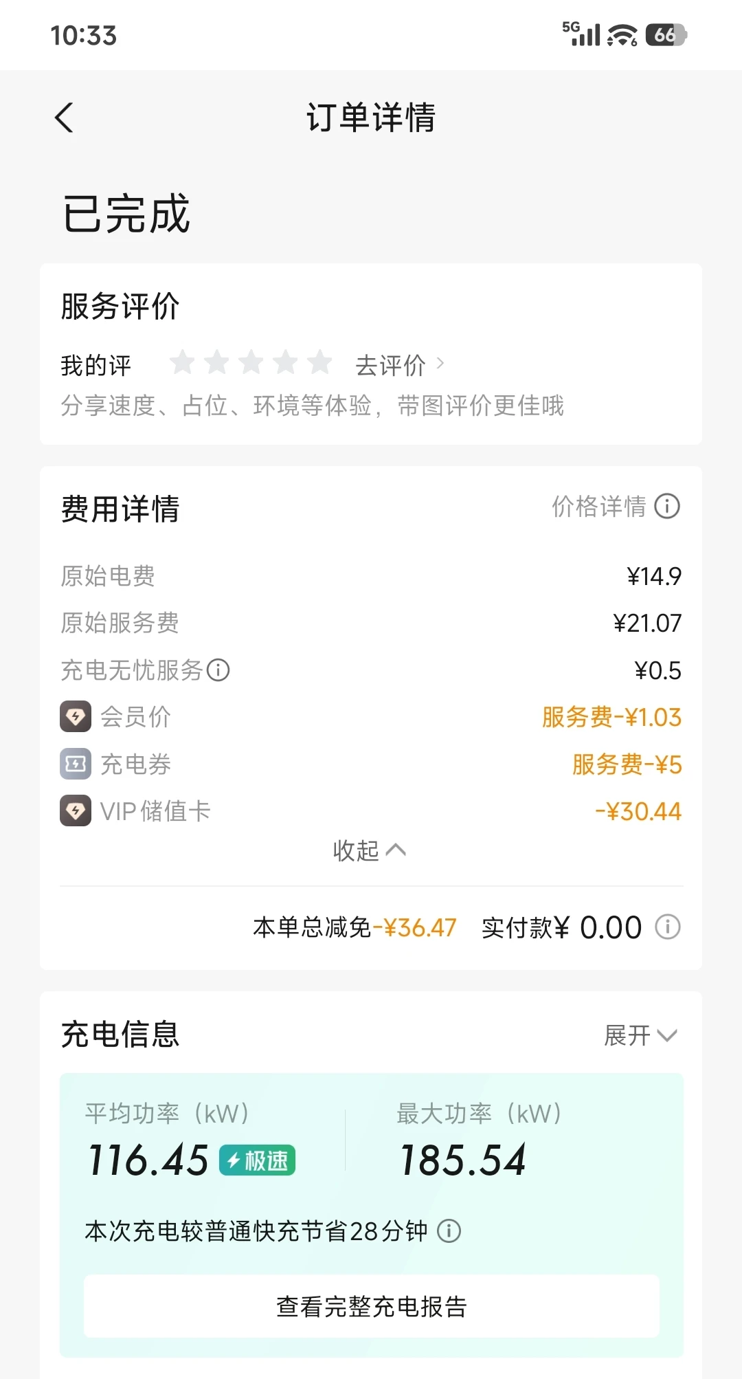 我选择在晚上或早上峰谷充电(0.66元/度),大概60元/单次充满,但实际上再叠加小鹏每月定向发送的电卡、服务费优惠券、积分,我仅支付30-40元,就可以满电续航587km了,一周一充,预估200元/月的用电费用。对比同期的油车成本预估1000元/月,那是省下了一笔“巨款”了!
