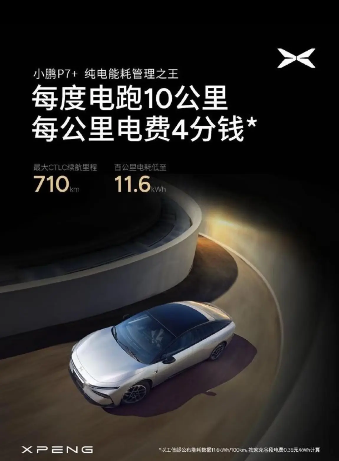拿最新车型小鹏P7+来举例,根据官方说法,这款车可以做到,每度电可以跑10公里,每公里电费仅需4分钱。