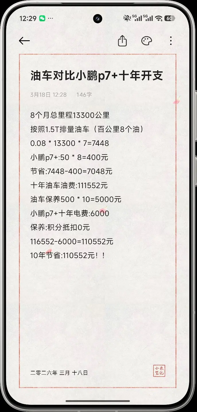 如果你和我一样,日常通勤+周末自驾,小鹏P7+的用车成本真的低到离谱: