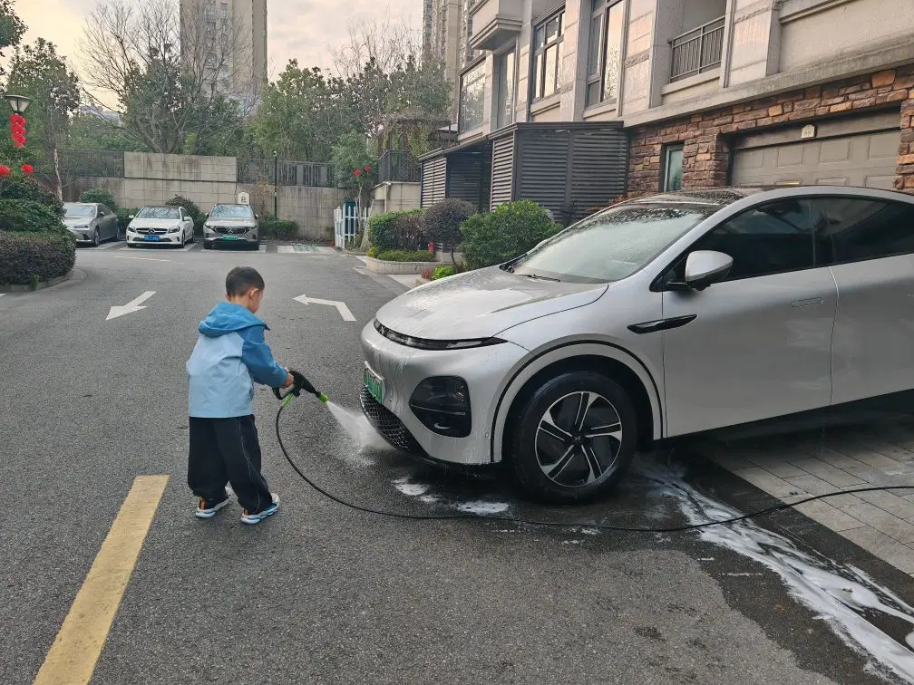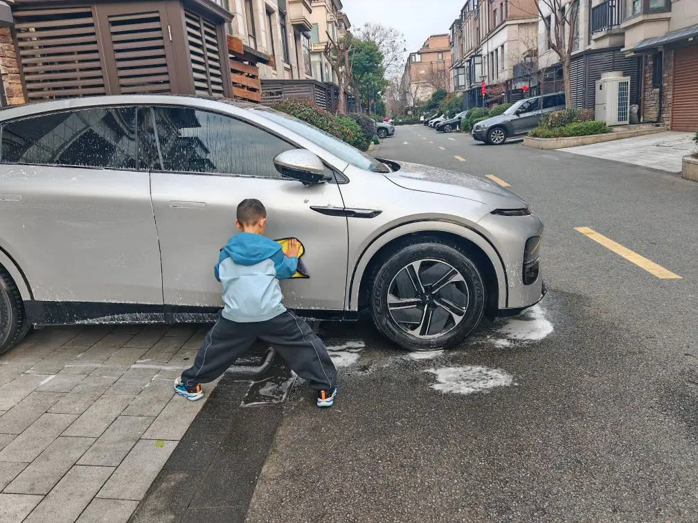 小小的身影举着水枪,认真地冲净车头的浮尘、格栅的缝隙,再拿着擦车巾,踮着脚仔仔细细擦过车门与轮毂,连车尾的G6标识都要擦得锃亮。
