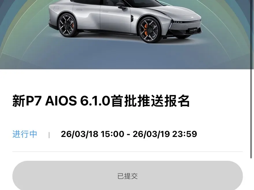 新P7 AIOS 6.1.0报名已提交,期待VLA 2.0带来的全场景从容,也期待无导航NGP漫游时,车与路的每一次温柔对话。