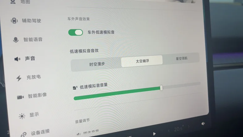 目前低速行驶时,车辆的低速声音比较少!建议在车辆设置-声音里新增多款低速车外音效,比如清新的电音、温和的提示音,替代单调的默认声。既提醒路人,不同的声音又能给爱车加点辨识度,安全又有范儿~