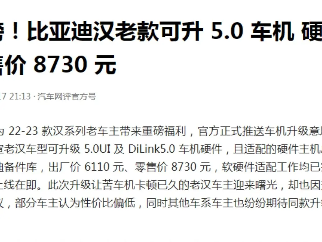 #鹏友共创# 最近,比亚迪发出通知,比亚迪汉老车主可以提升车机性能,费用8700多元。这一升级可以提升车辆使用效果和安全。作为第一批小鹏P7车主,五年多了,也希望有提升机会,希望小鹏要关注这方面的需求。