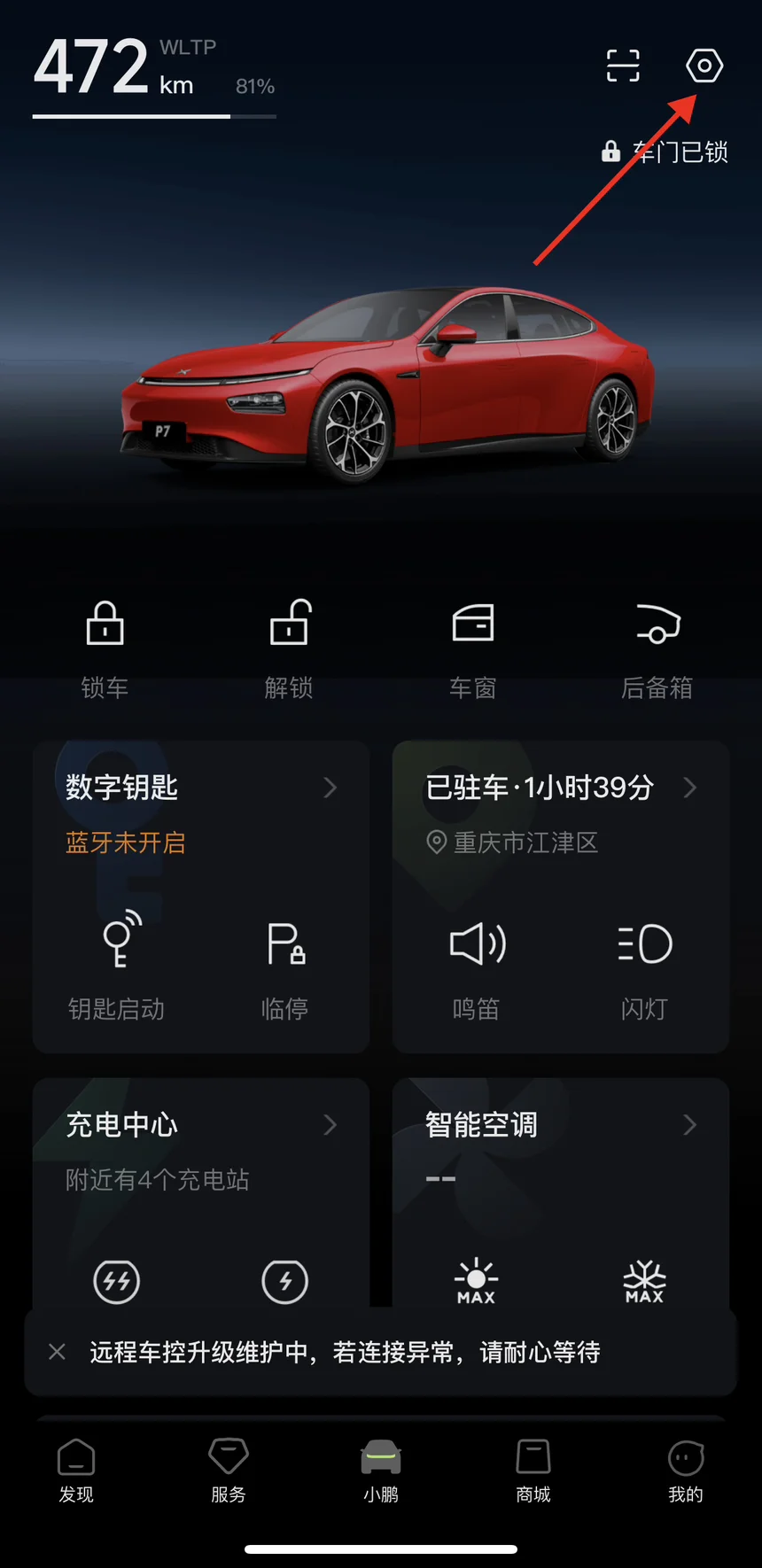 1. 打开小鹏App「小鹏」页,点击右上角齿轮图标进入设置页面。