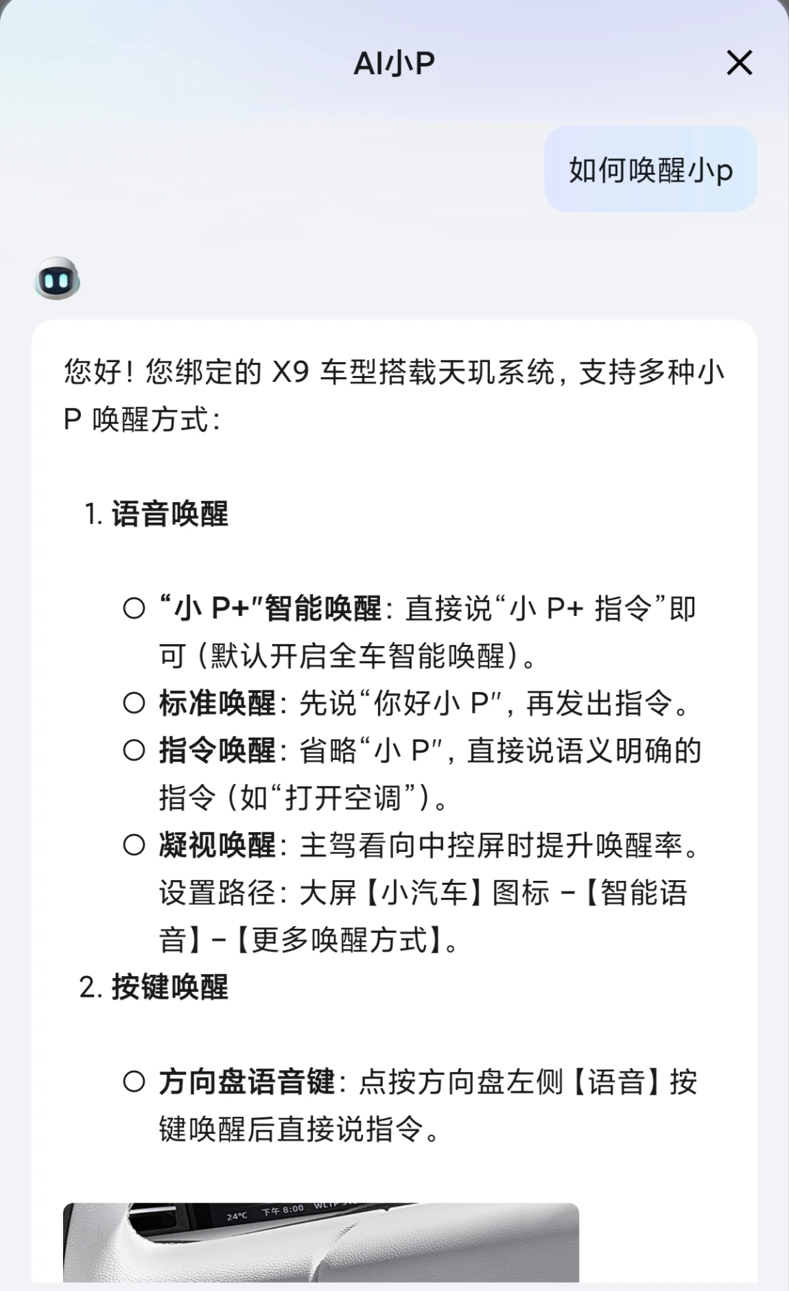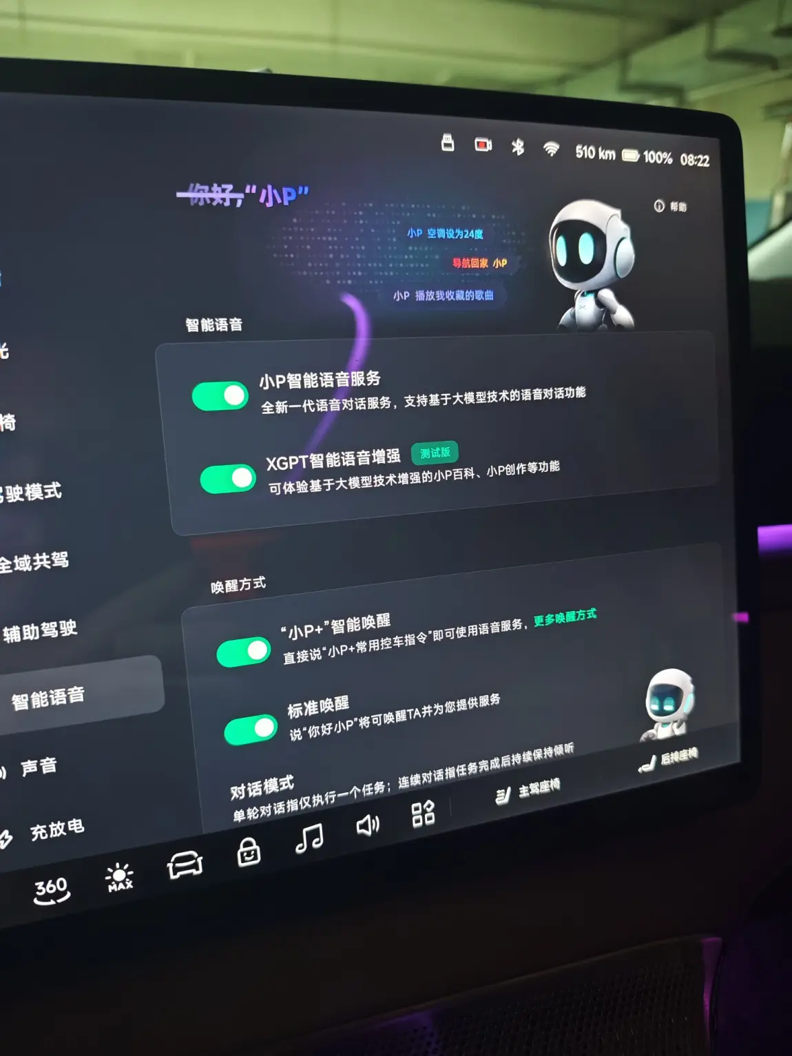 唤醒小P有多种方法。最常见的是通过语音,你可以直接说出默认唤醒词“你好小P”或“小P”。如果觉得不方便,还可以在中控屏设置里自定义一个你喜欢的唤醒词。此外,方向盘上设有专门的语音按键,按下即可唤醒;后排乘客也能通过后排车门上的按键轻松激活,确保车内每位成员都能随时使用。