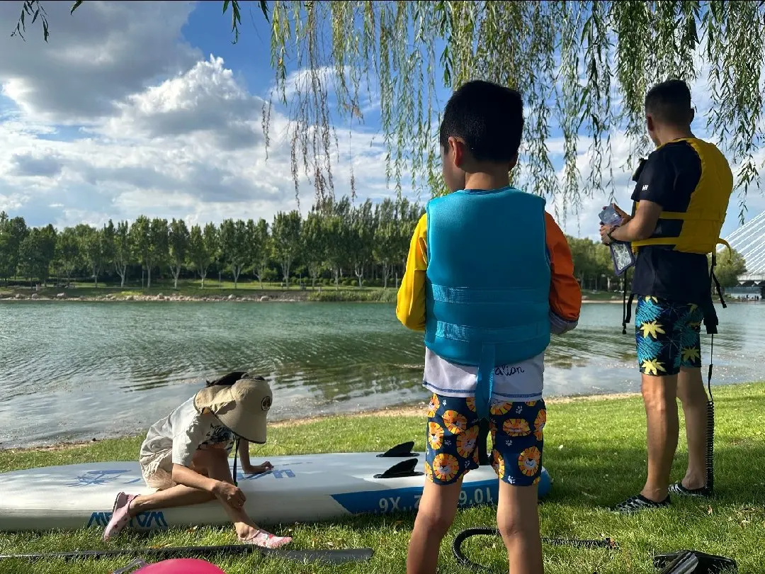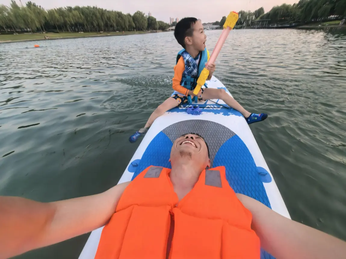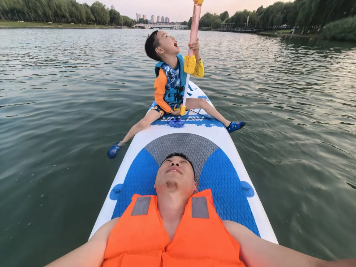 不知从何时起,心里悄悄种下了一颗玩桨板的草🌱。搜了搜周边,适合下水的地方还真不少,最终锁定了北龙湖这片河道水域💦。听说这里水质极佳,用的还是南水北调的丹江水,当即下单了桨板,也给孩子安排了救生服🦺——这可是保命装备,再马虎都不能在这上面偷懒,哪怕我们全家都会游泳。