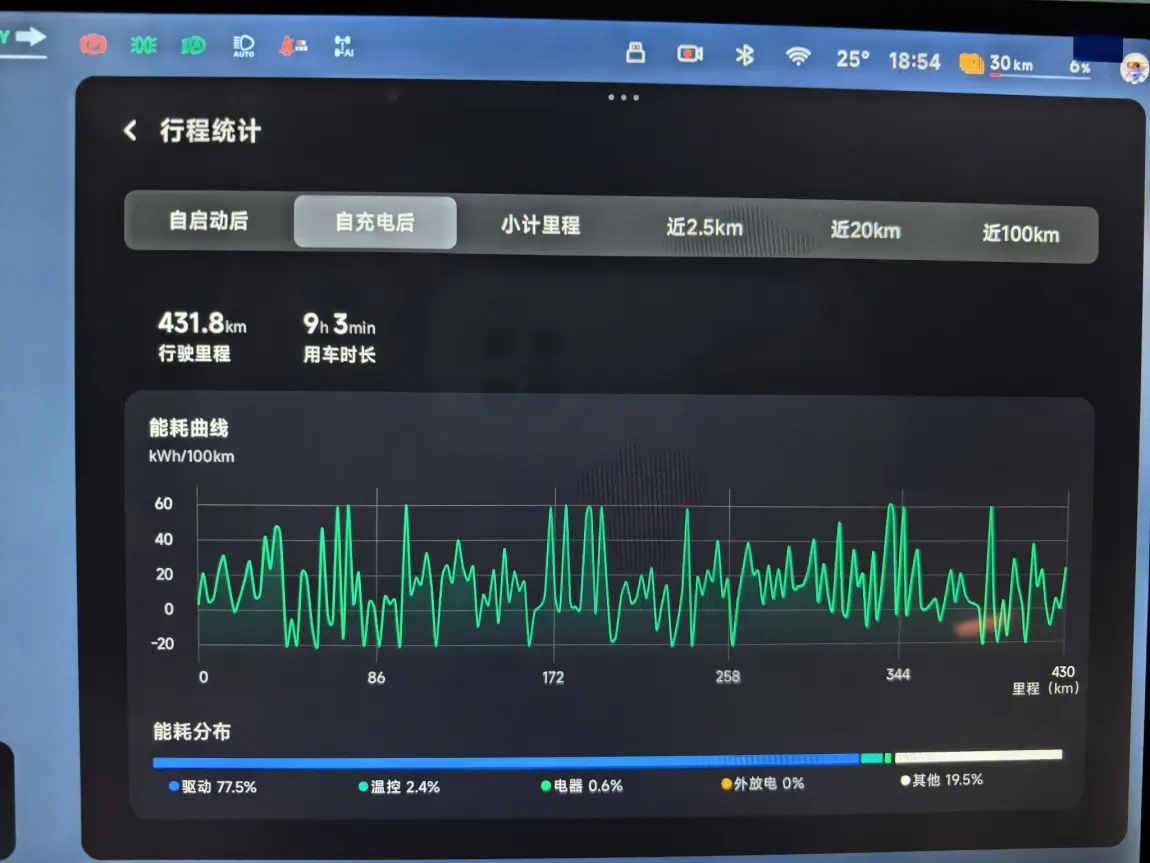 2、电耗方面还是很不错的,按照这次的里程数据,达到了九成,小鹏电控技术确实好,这些综合道路行驶了431.8公里,剩余30公里的续航,回到家充电。