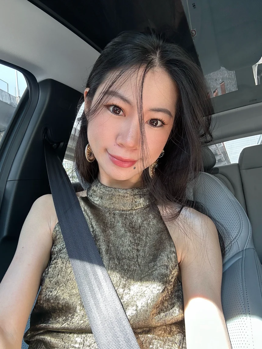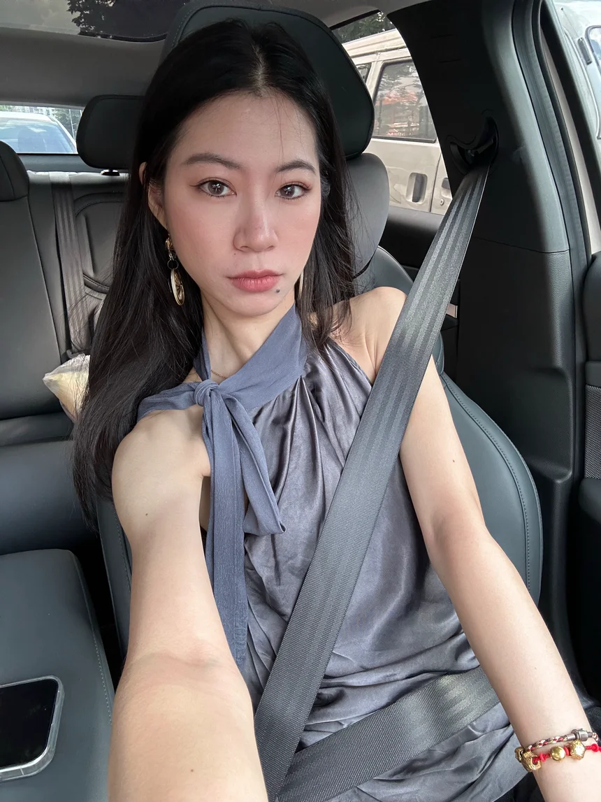 浅灰色垂感挂脖,下装是高腰西裤,踩一双尖头高跟鞋,配饰只选耳环,坐在驾驶位利落又不失温柔。