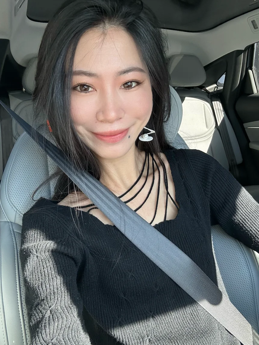 黑色高领毛衣搭配棕色腰带,下身垂感针织裤,头发扎成低马尾,Mona的浅色内饰和穿搭完美融合,堵车时也能靠这份松弛感稳住情绪。