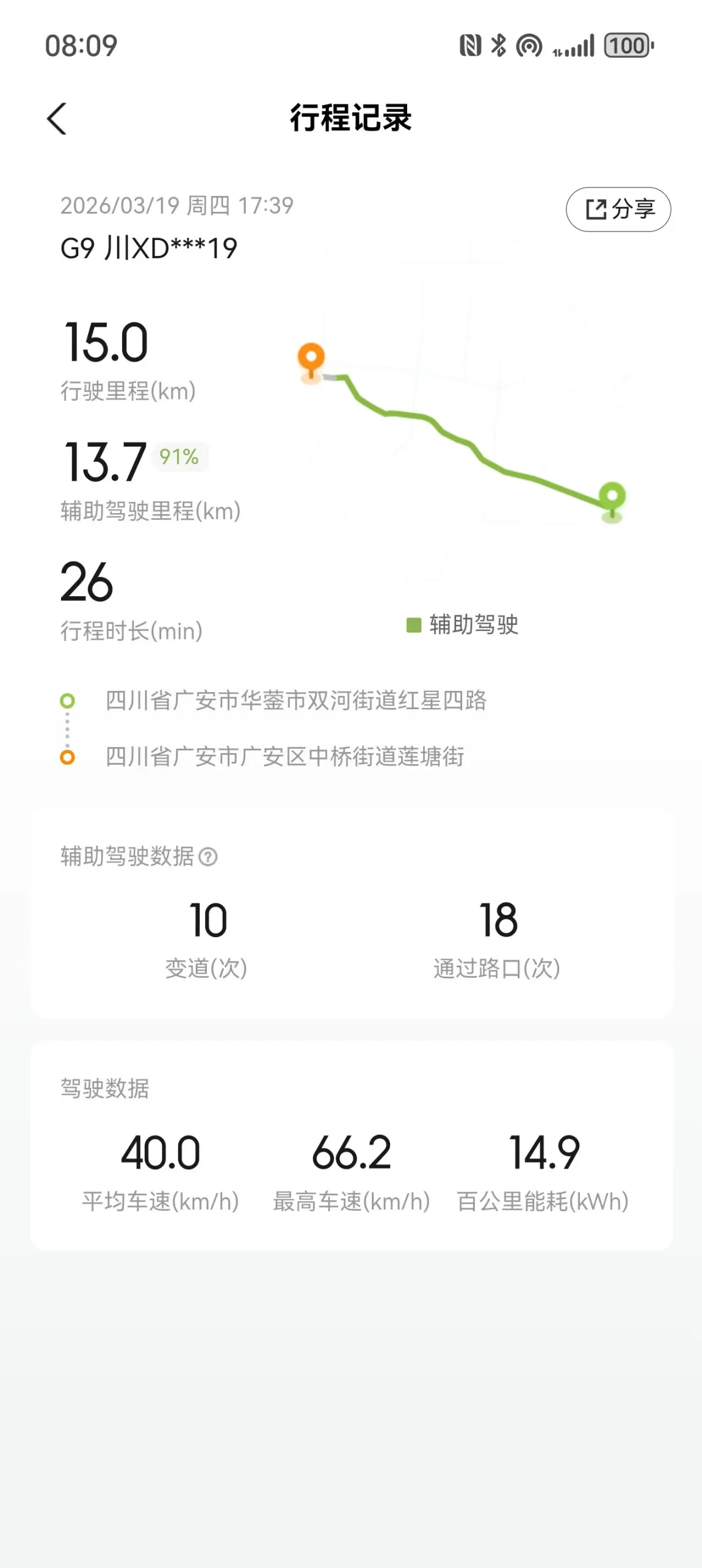 - 3月19日:行驶15.0km,辅助驾驶13.7km(占比91%),平均车速40.0km/h,百公里能耗14.9kWh