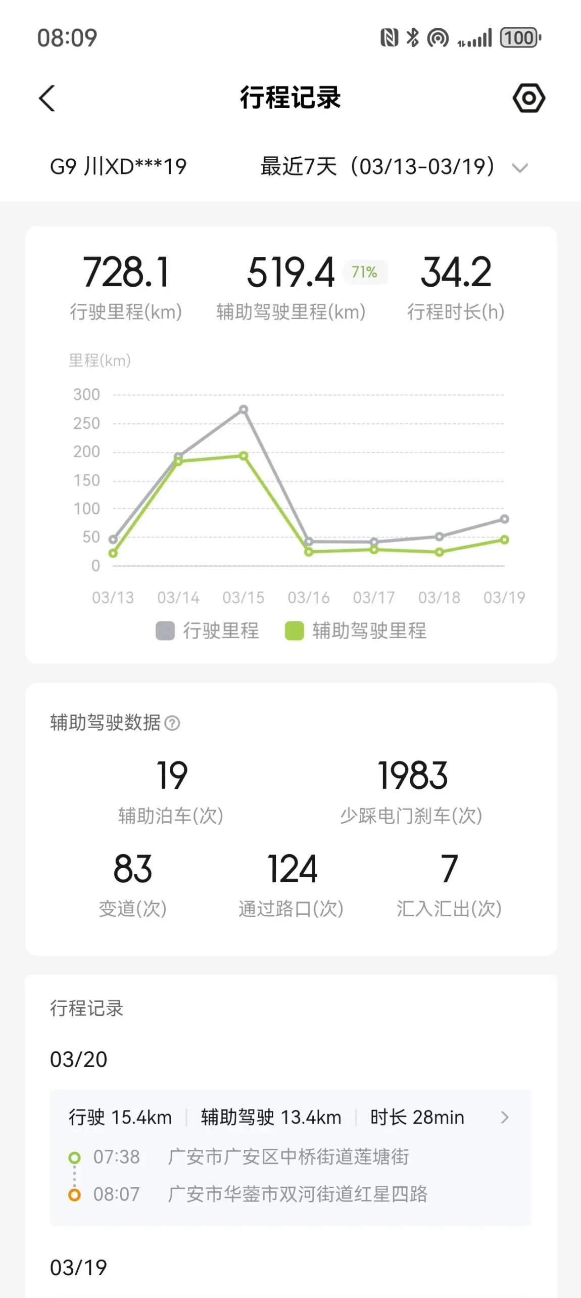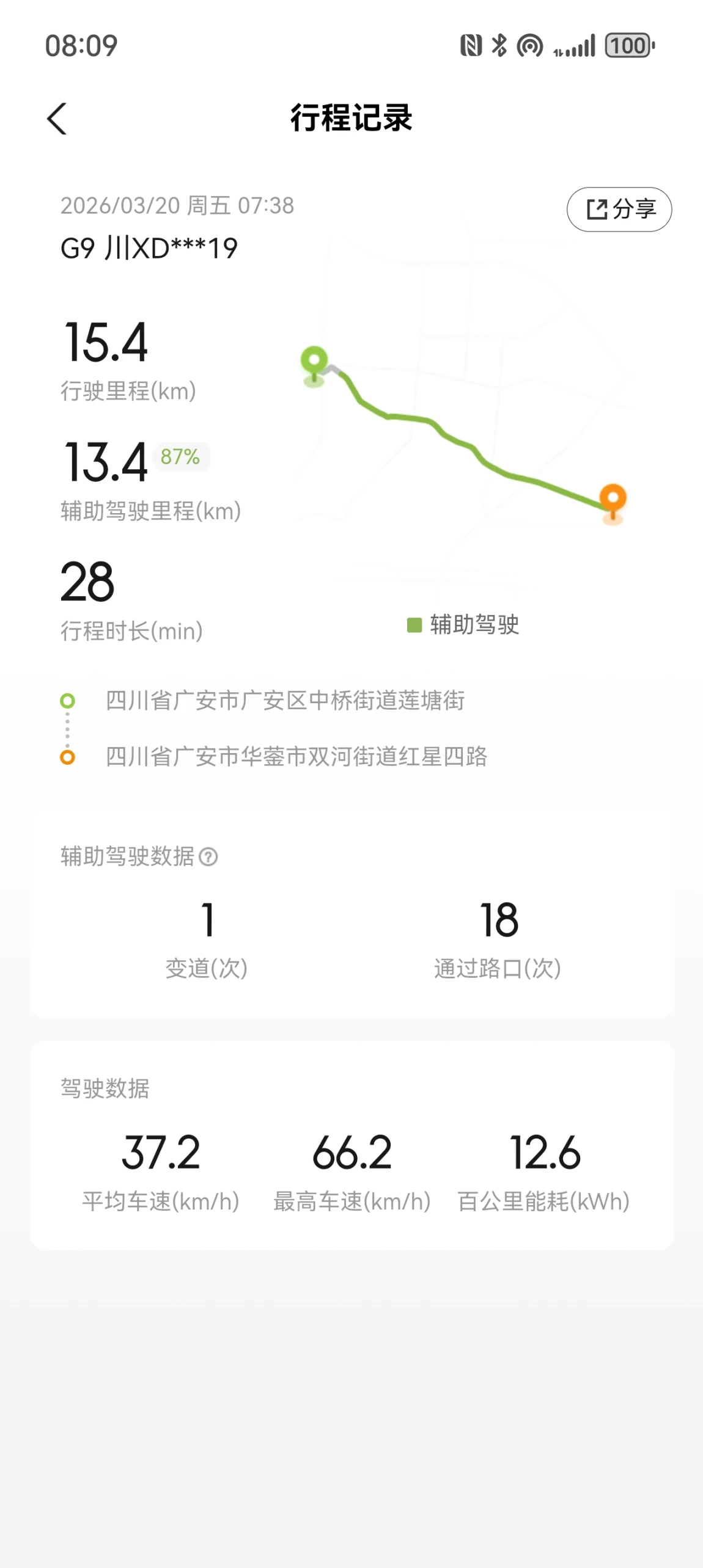 - 3月20日:行驶15.4km,辅助驾驶13.4km(占比87%),平均车速37.2km/h,百公里能耗12.6kWh