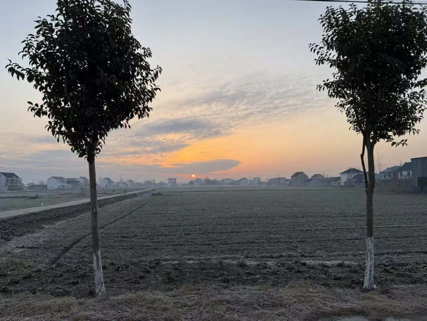 开阔田野向远方铺展,落日把天际晕染成温柔的橘橙,田垄在暮色里静静呼吸,车窗外的乡野暮色,是都市里难寻的治愈底色。