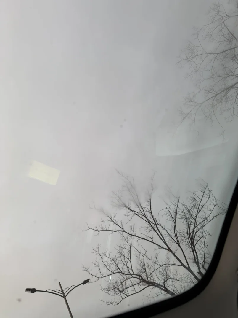 薄雾漫过窗玻璃,光秃秃的枝桠在朦胧里勾勒出疏朗线条,像是一幅写意水墨,让平凡的通勤时光浸染上静谧禅意。