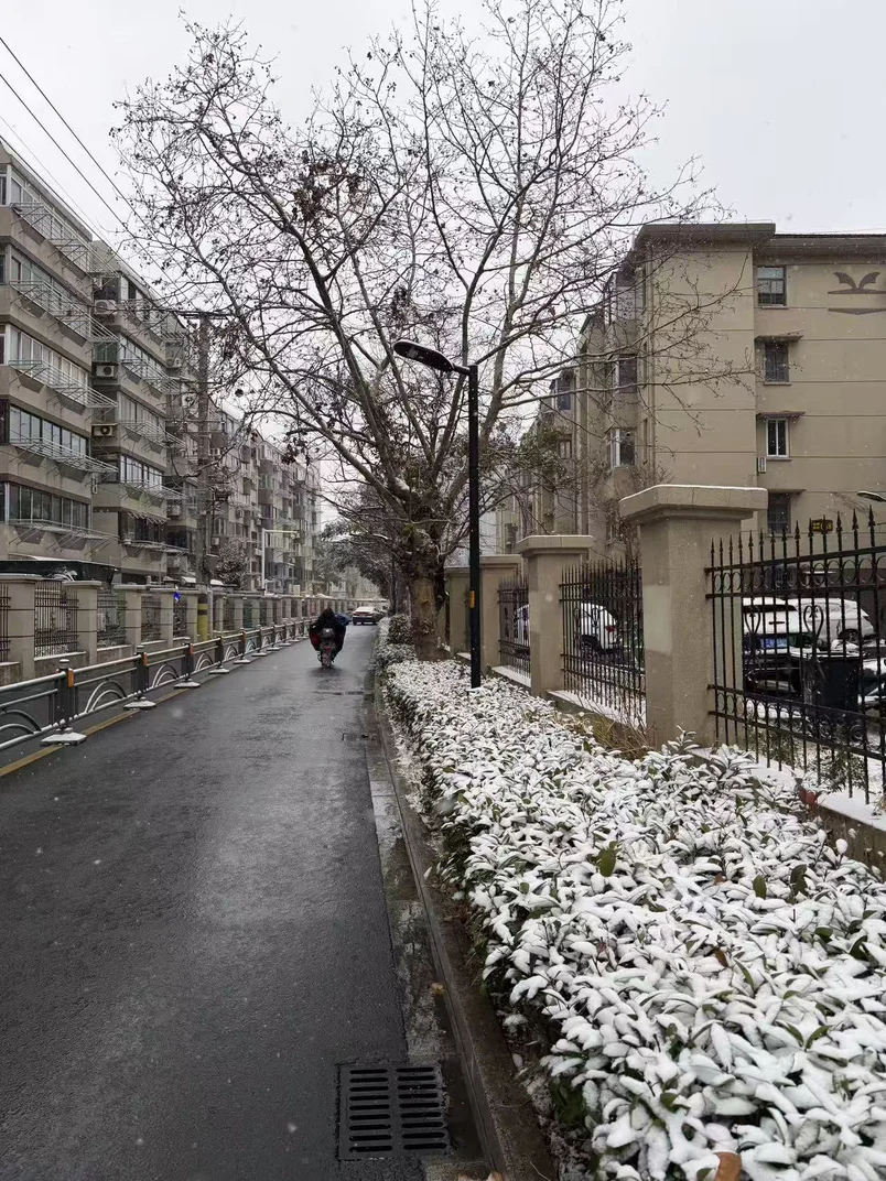 残雪覆在绿化带的枝叶上,湿润步道向远方延伸,骑行者的身影在冬晨里缓缓前行,清冷空气里藏着江南冬日的细碎浪漫。