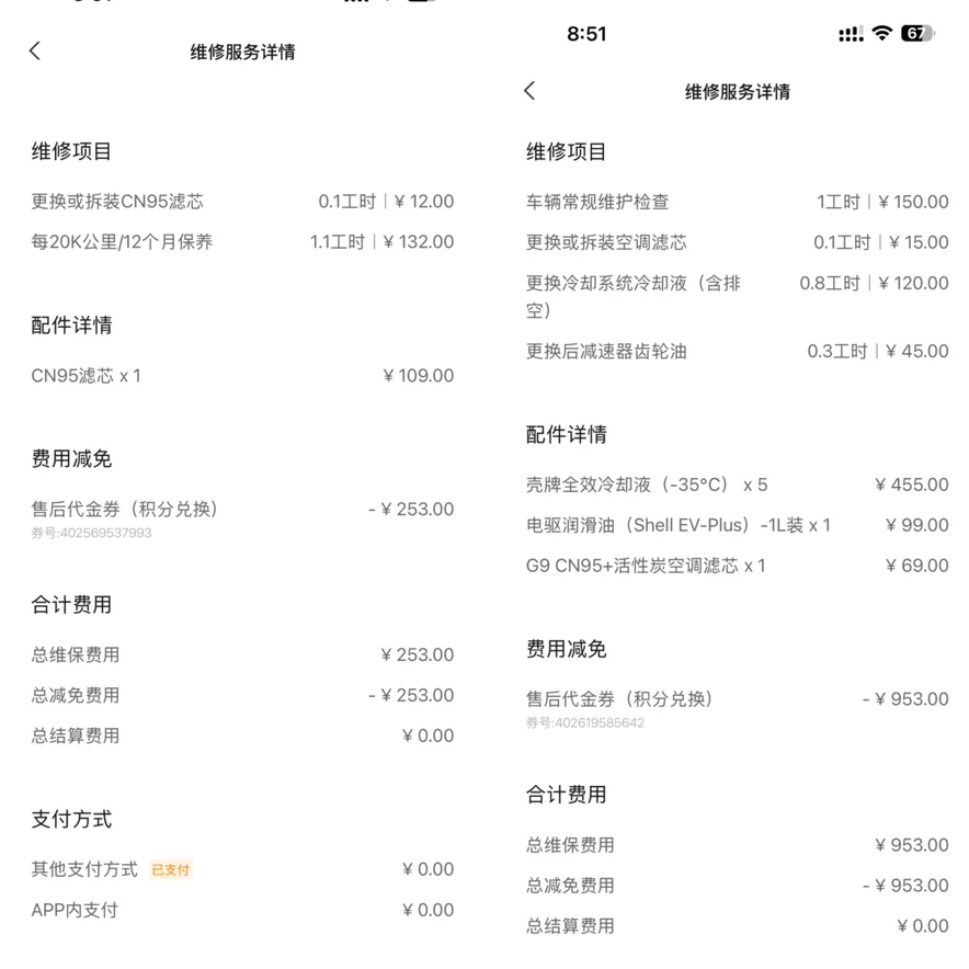 每次看APP上显示的保养数据,它都像个懂事的小伙伴在提醒我:咱悠着点开,还能再省一大笔!”原来我的油车5000公里保养一次,基础的小保养就要大几百,心疼到不行!现在我的G9 2万公里才保养一次,基础保养两百来块,就算8万公里大保养也比油车省的太多了,频率低就算了还能用积分全额抵扣,等于保养完全不花钱,一年4万公里左右,这保养费用太香了。