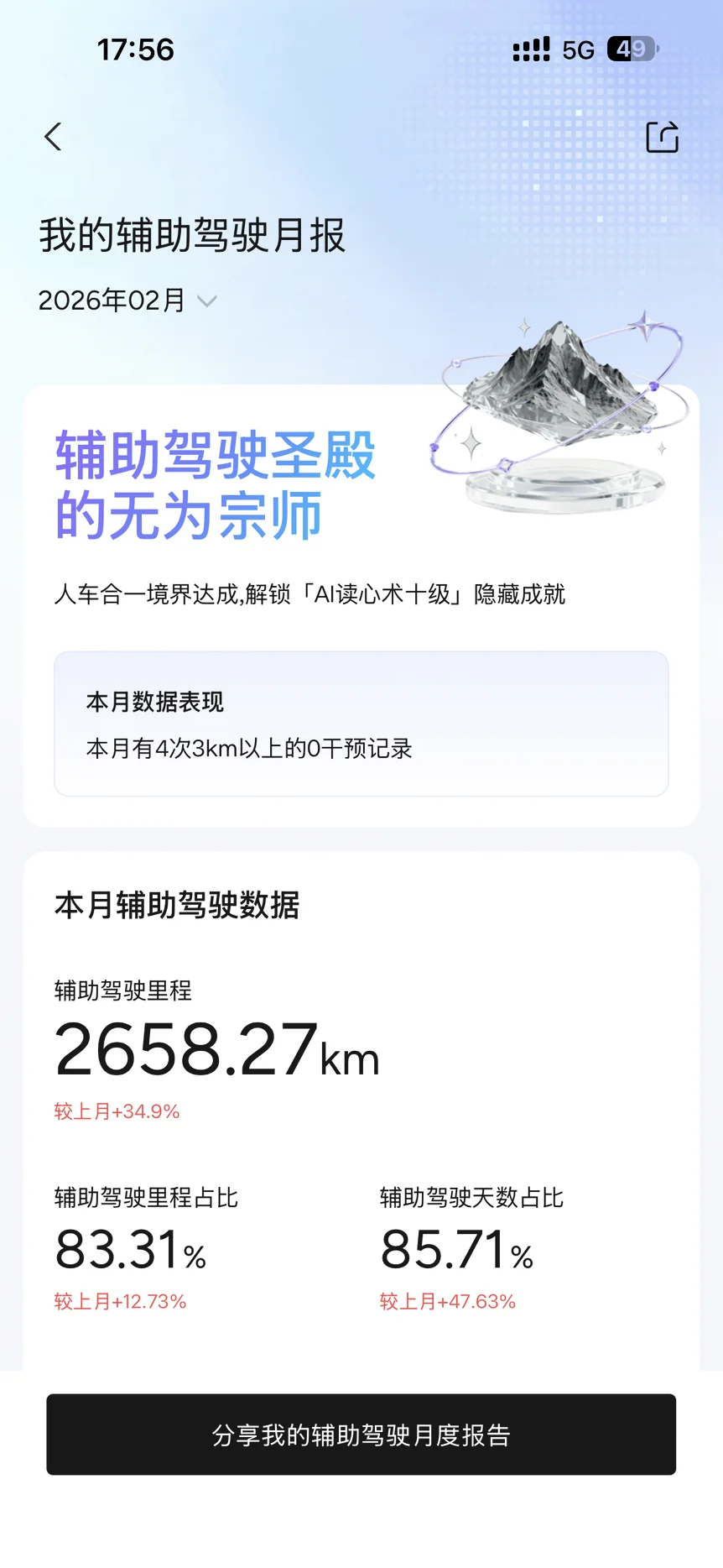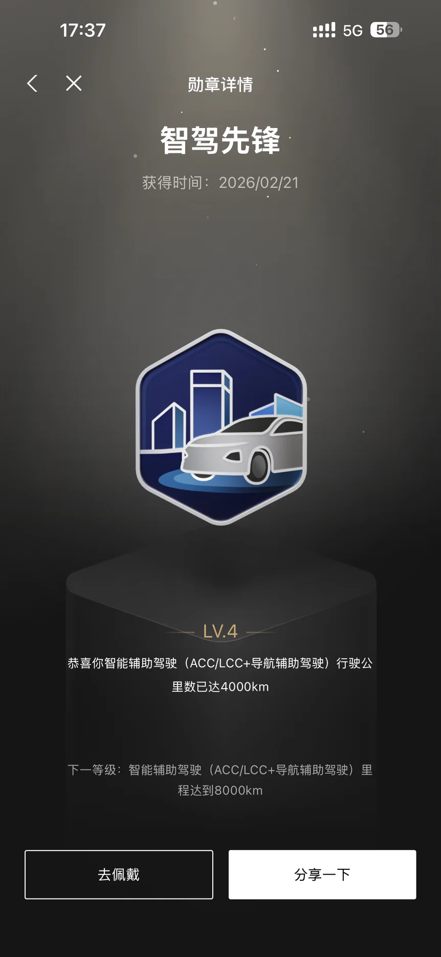 • 进阶的动力:它不是一个静止的荣誉。看到 LV.4 和下一个目标(8000km),会激励我继续在合适的场景下使用智驾,有一种玩游戏升级的快乐。