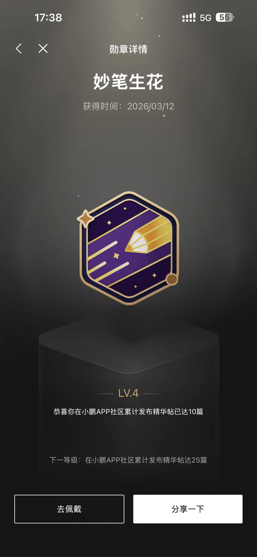 • 艺术与创意的结合:勋章名字“妙笔生花”非常典雅,设计也是五边形配上金色流星笔,不像其他智驾勋章那么生硬。它展示了小鹏社区对内容创作和人文色彩的重视。